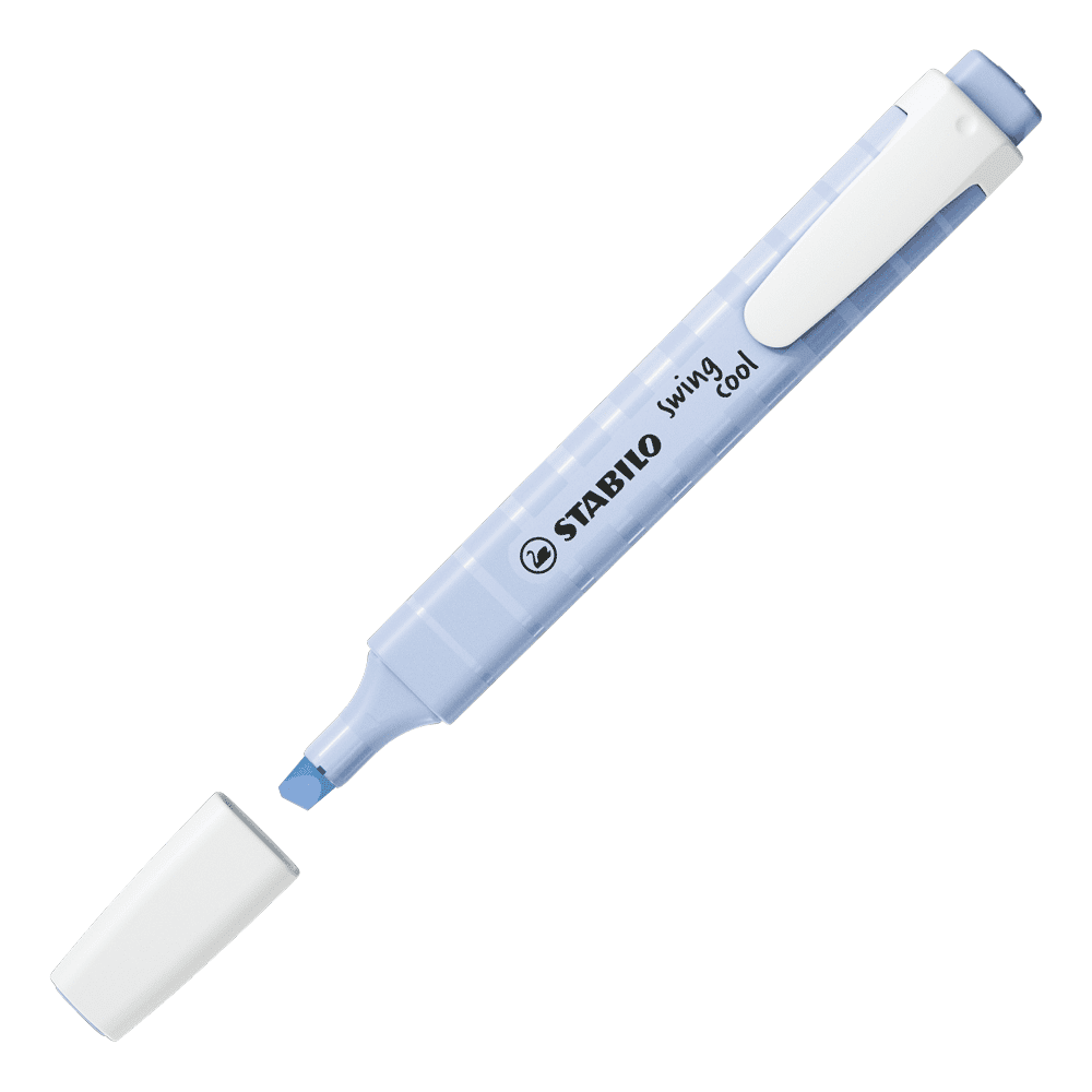 STABILO - Surligneur swing cool Pastel Edition - Bleu pastel . Difficile de passer à côté des 10 couleurs du surligneur STABILO swing cool Pastel ! Des couleurs pastel uniques qui transforment le célèbre surligneur de poche en compagnon créatif pour customiser ses notes et son journal créatif.. Sa pointe biseautée de 1,0 - 4,0 mm assure un tracé fin et précis. Il est parfait pour se concentrer sur l'information essentielle, mais également dessiner et tracer. Son corps fin avec agrafe lui permet de se glisser dans toutes les poches et toutes les trousses.. Comme tous les surligneurs STABILO, il intègre une technologie anti-dessèchement - il peut rester ouvert 4 heures sans sécher..