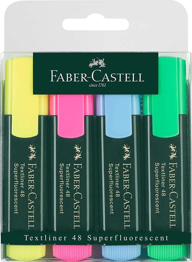 FABER-CASTELL - Surligneur "Textliner 48 Refill" - Etui de 4   . Le surligneur 1548 garantit un marquage vif sans laisser de traces sur tous types de papiers. Six couleurs lumineuses offrent un grand choix. Grâce à la pointe spéciale en polyester, les passages de texte peuvent être accentués individuellement et précisément dans trois largeurs de trait différents. Un signe clair pour l'environnement : L'encre est à base d'eau et facilement rechargeable avec la recharge Textliner 1549 Automatic Refill..