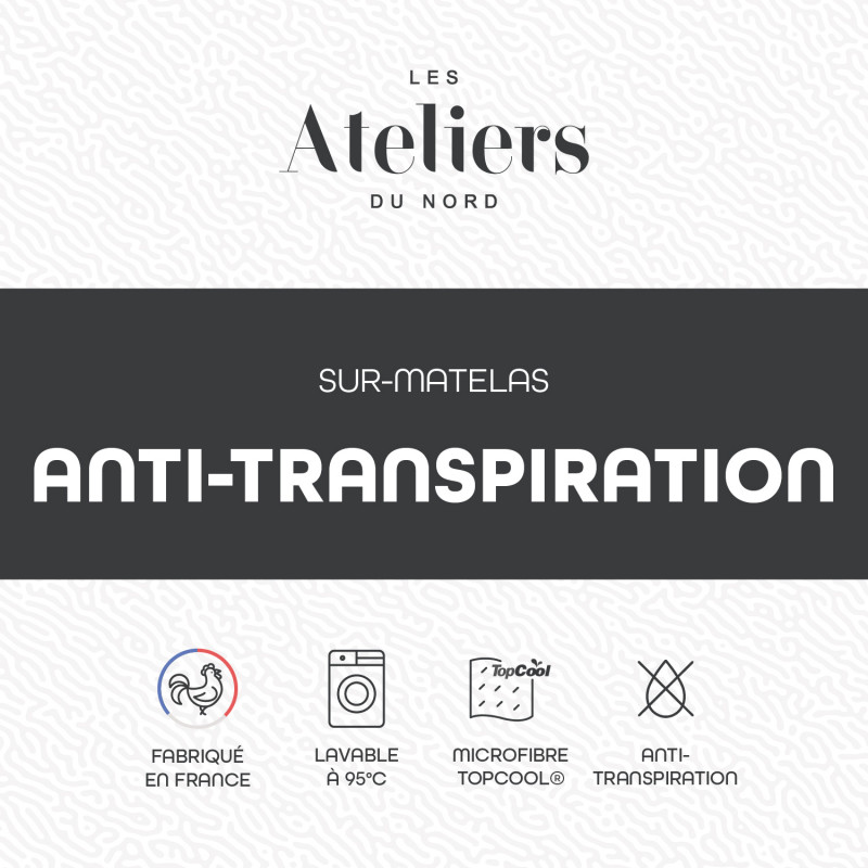 Le sur-matelas de confort Ateliers du Nord est l'accessoire idéal pour des nuits douces et reposantes. Grâce à sa fibre TOPCOOL de haute technologie, il offre une excellente respirabilité et facilite l'évacuation de l'humidité pour un effet anti-transpiration assuré. Sa texture tout douce apporte un confort optimal et sa fabrication française de qualité est gage de durabilité.