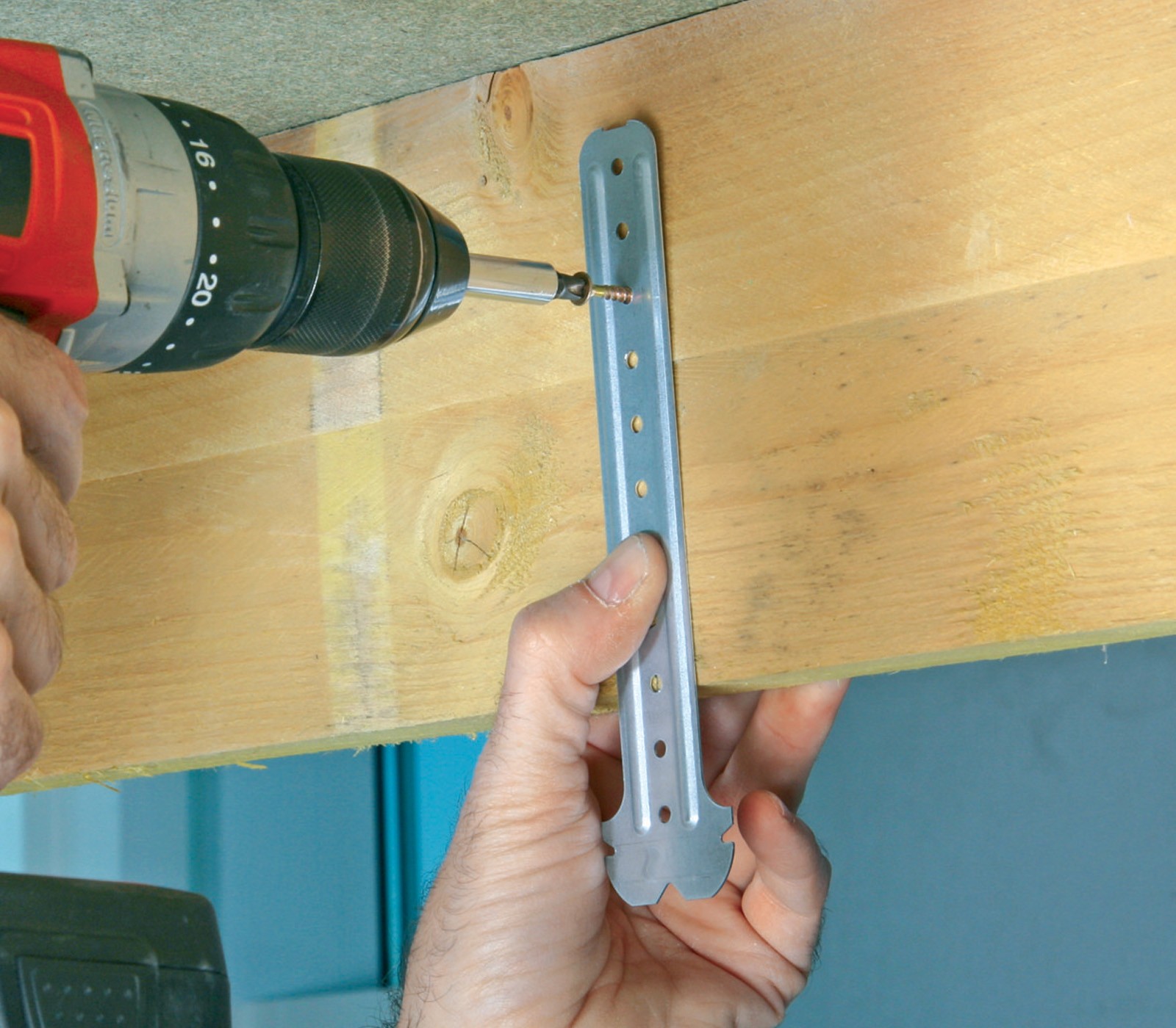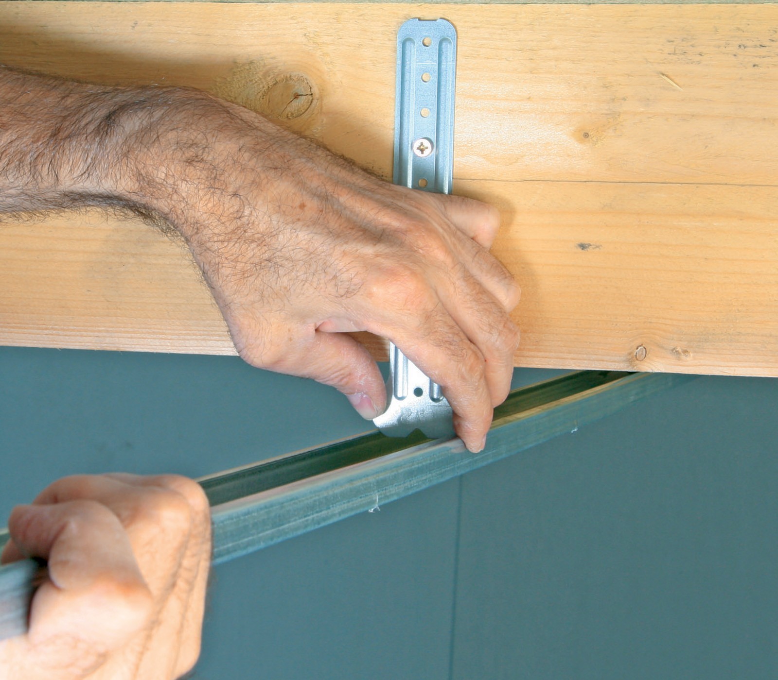 1. Fixation des suspentes en bordure de charpente, perpendiculairement au chevron.