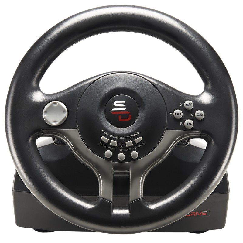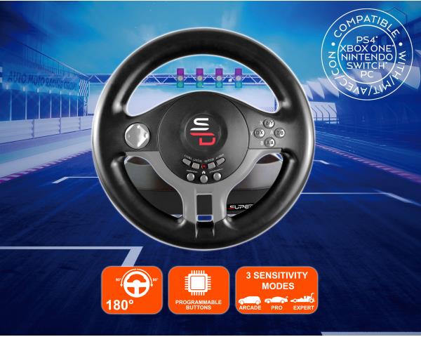 Le volant de course SV 250 vous propose un angle de rotation ludique de 180 qui s'adapte à vos habitudes de conduite. Il est entièrement programmable avec 3 niveaux de sensibilité réglables directement depuis le volant. Super pratique, le volant racing SV 250 est équipé de ventouses pour se fixer sur un bureau ou n'importe quelle surface plane. Compact avec sa roue de 22 cm, il se range facilement.