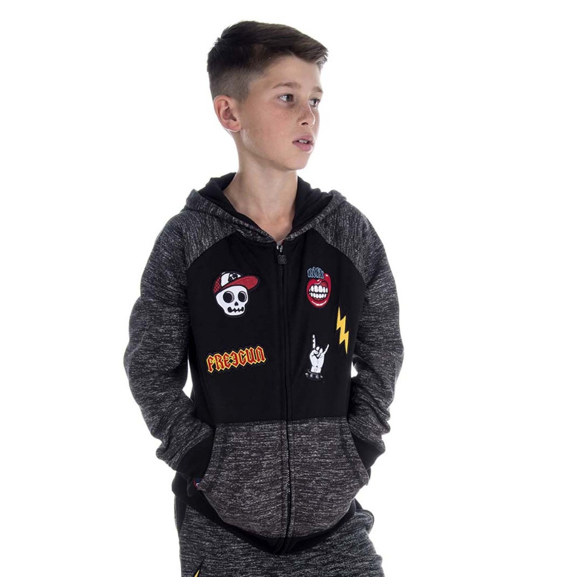 Dévoile ton style rock avec ce sweat à capuche noir et gris. Tu as droit à des super motifs colorés sur le devant.