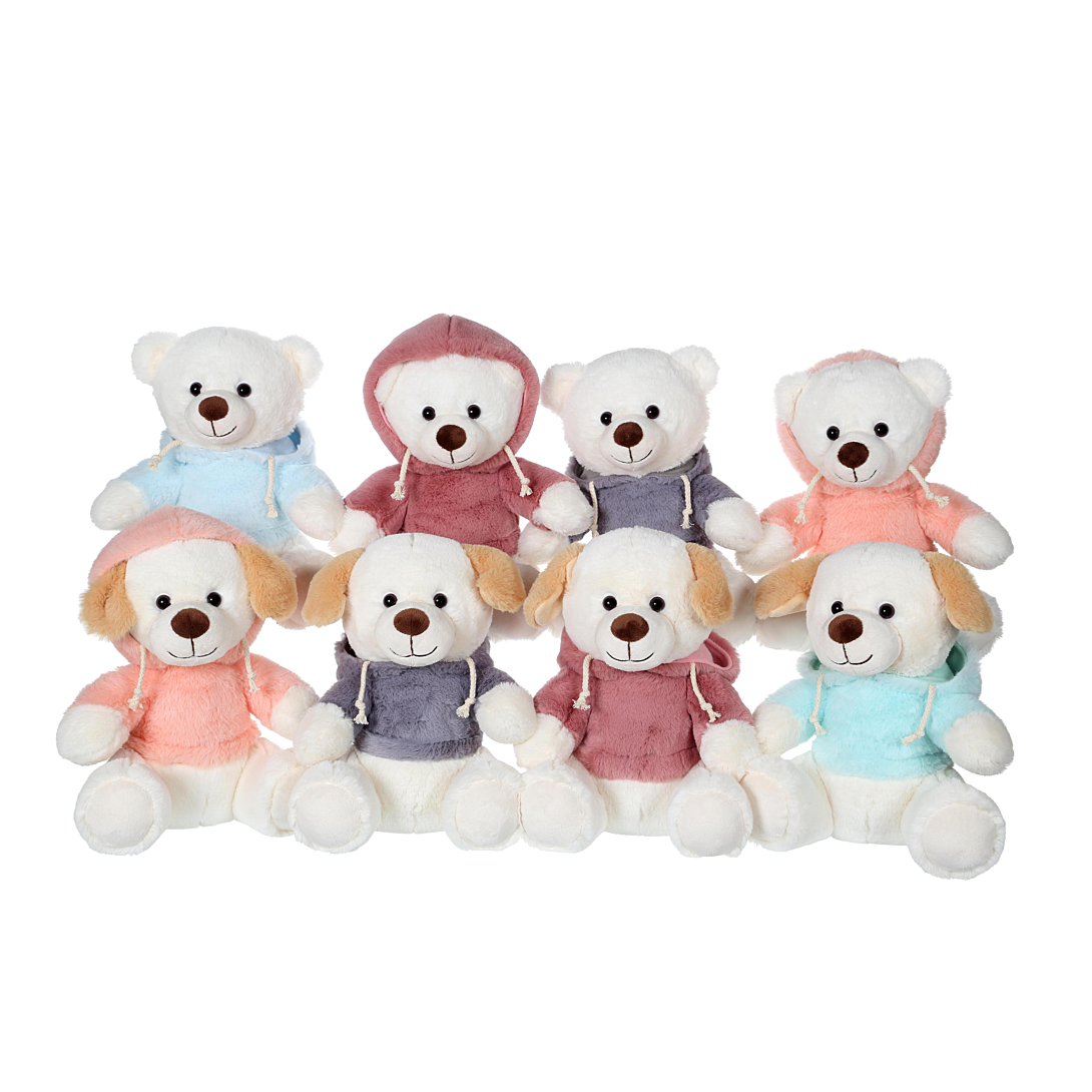 Une jolie famille d'ours et de chiens aux sweats à capuche colorés. Cette peluche de 22 cm au regard coquin est extra douce et moelleuse, facile à prendre en main et sera le meilleur ami de celui qui l'adoptera. Trop rigolo : on s'amuse à lui mettre sa capuche pour un look plus décontracté.