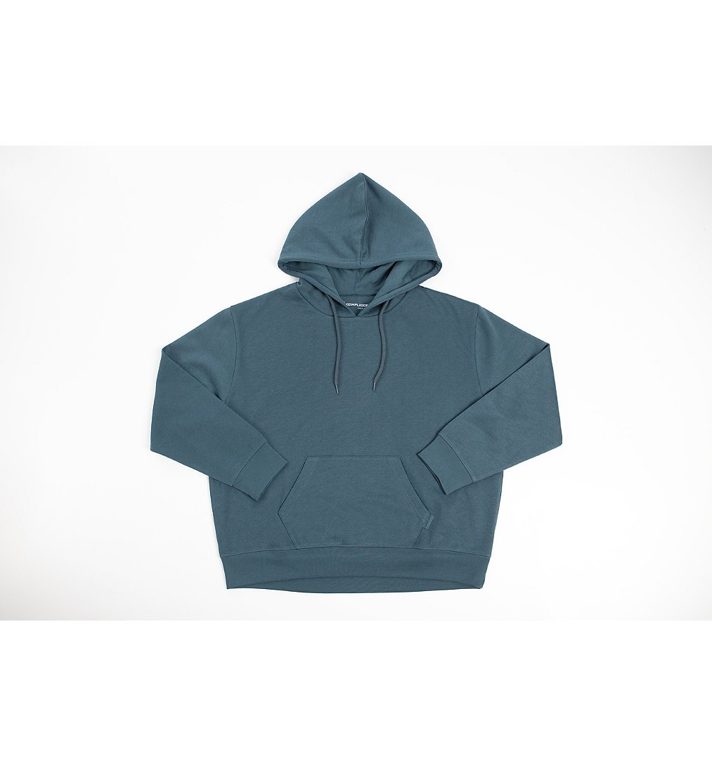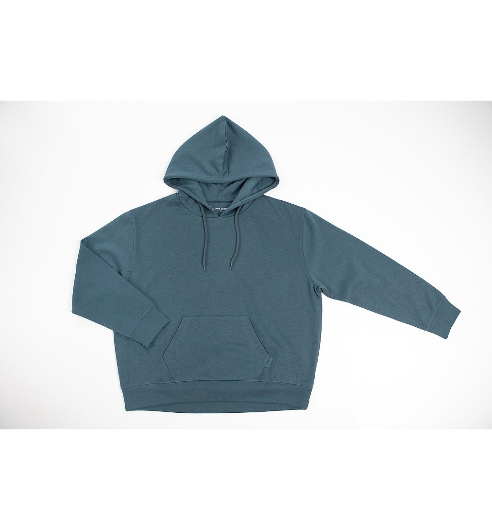 sweat uni complices femme à capuche bas corps devant et dos légèrement arrondis en molleton gratté 260gr/m² coloris bleu émeraude - poche kangourou devant - 1 étiquette complices sur côté poche - Print de taille intérieur dos