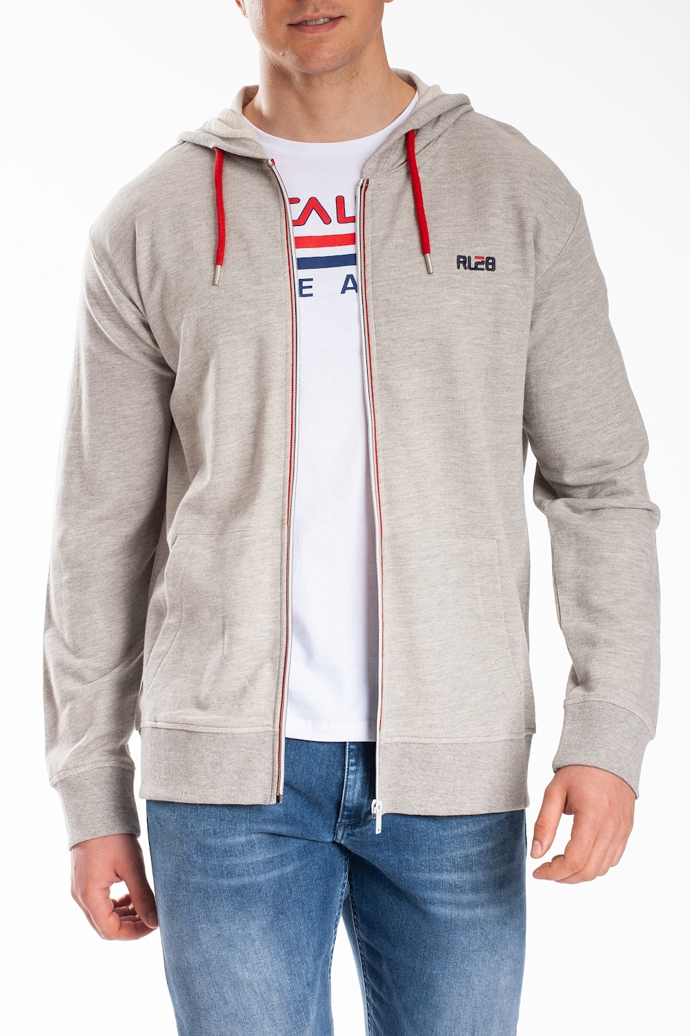 Sweat zippé à capuche, poches kangourou, finitions en rib aux extrémités, fermeture éclair rayée, cordon de serrage de la capuche en coloris contrasté, broderie RL28 côté coeur, molleton non gratté, coton 100%. Le mannequin porte une taille L.