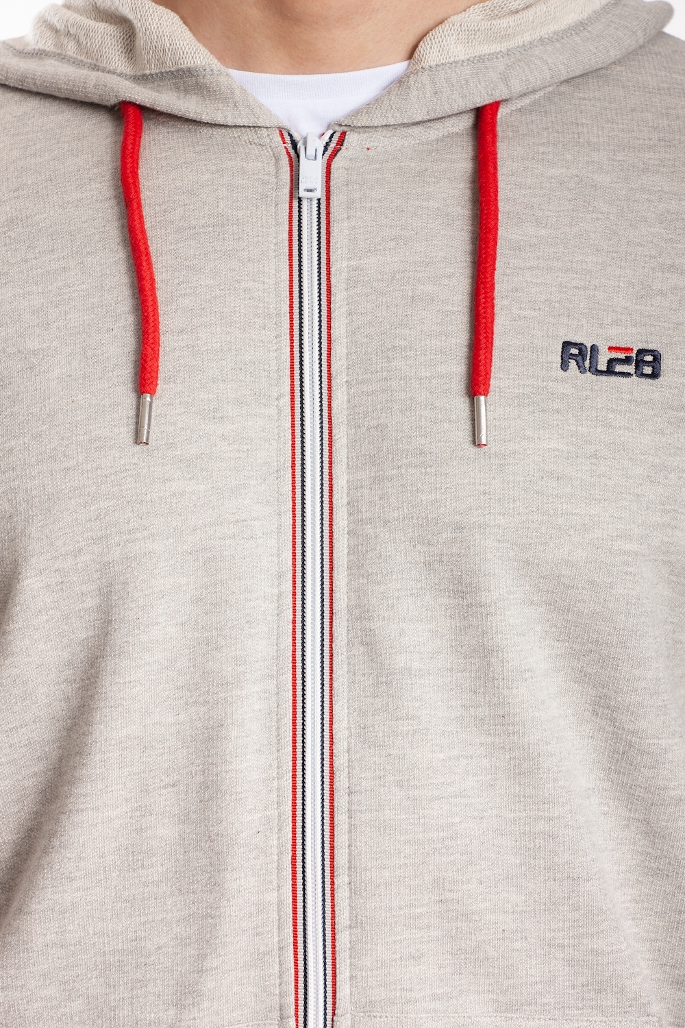 Sweat zippé à capuche, poches kangourou, finitions en rib aux extrémités, fermeture éclair rayée, cordon de serrage de la capuche en coloris contrasté, broderie RL28 côté coeur, molleton non gratté, coton 100%. Le mannequin porte une taille L.