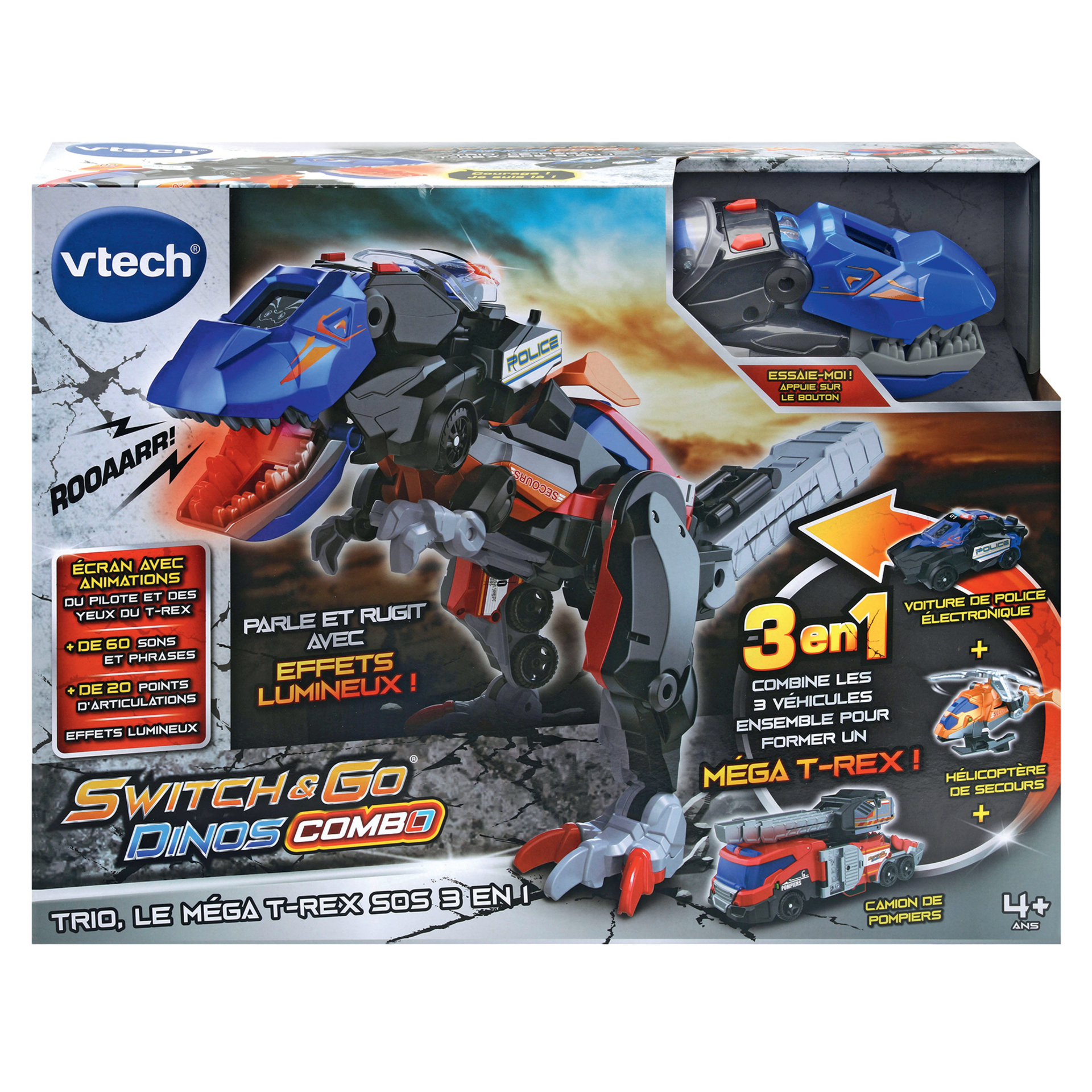 Switch & Go Combo - Trio, le méga T-Rex SOS (3 en 1) - 4 ans + Trio, le méga T-rex SOS 3 en 1 se transforme en quelques manipulations en 3 véhicules de secours ! 3 en 1 pour encore plus de jeu : - Une voiture de police avec écran LCD, gyrophare lumineux et effets sonores. - Un hélicoptère avec rotor tournant - Un camion de pompiers avec échelle extensible et rotative Une fois assemblés, les trois véhicules se transforment en T-rex géant avec effets sonores et lumineux. 17 points permettent de l’articuler et de lui donner différentes poses. Deux modes de jeu : mode Véhicule et mode Dino. Chaque mode se déclenche automatiquement lorsque la transformation est effectuée. Les voix et les animations changent en fonction du mode de jeu. Avec plus de 30 sons réalistes et phrases liés à l’univers des dinos et des effets lumineux. Arrêt automatique. Boîte Try-me. Fonctionne avec 2 piles LR6 fournies.
