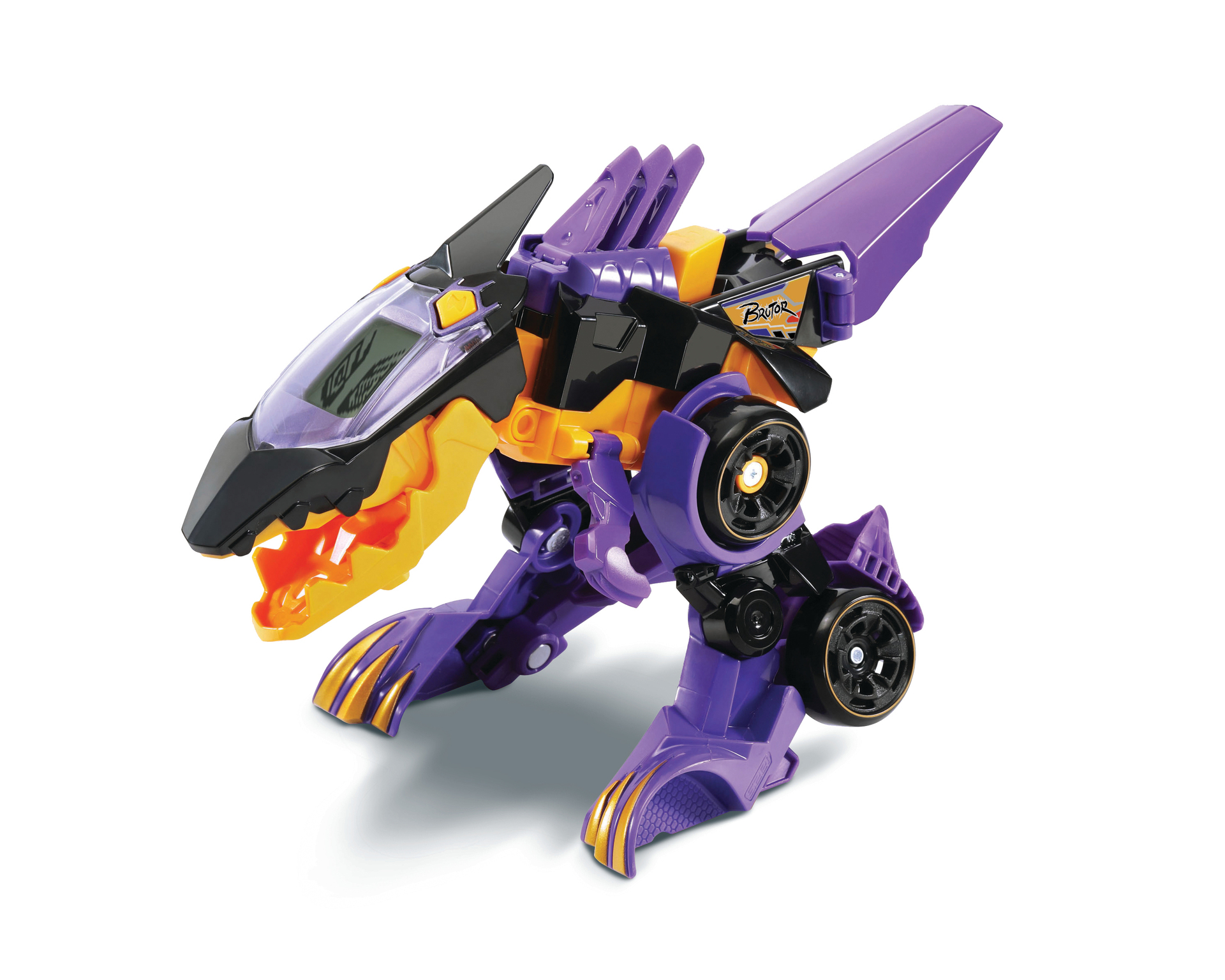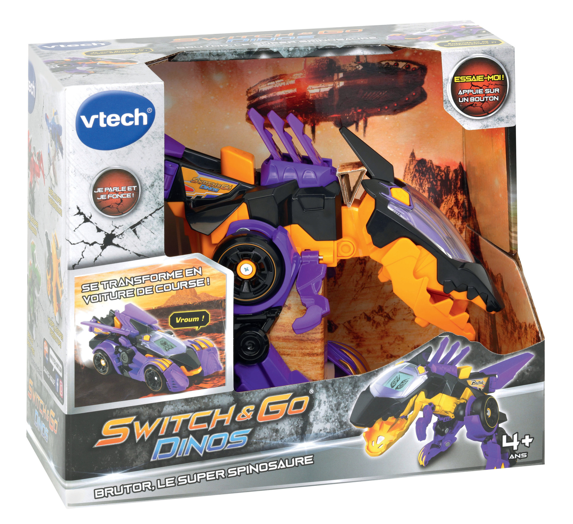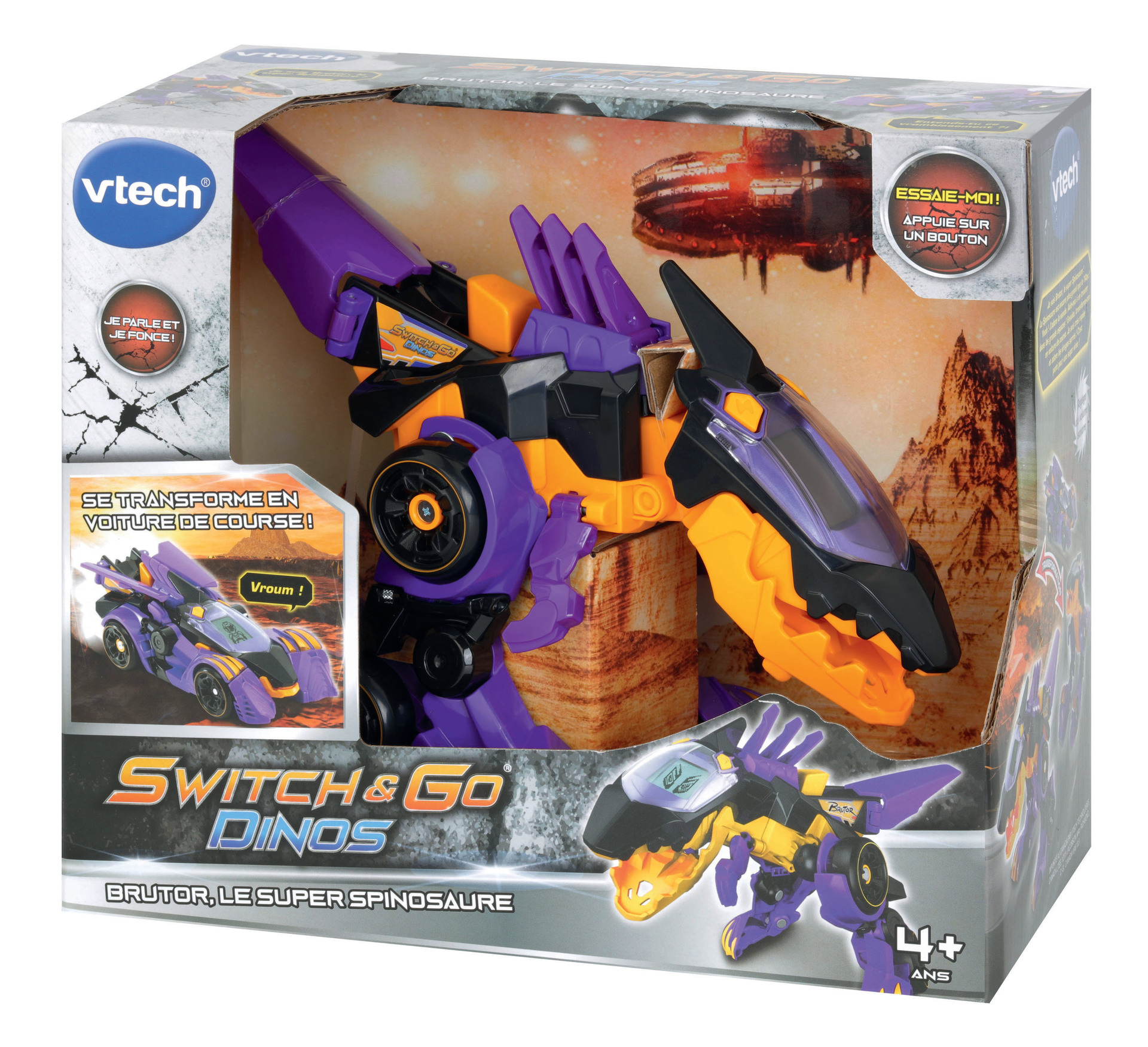 Switch and Go Dinos - Brutor, Super Spinosaure - 4 ans + Un Spinosaure à transformer en voiture de course ! Deux modes : mode Véhicule et mode Dino. Chaque mode se déclenche automatiquement lorsque la transformation est effectuée. Écran LCD avec animations : pilote pour le mode voiture et yeux de dino pour le mode dinosaure. Boutons pour déclencher les phrases et les effets sonores et bouton "Action" en mode Dino pour faire bouger les pattes et ouvrir la mâchoire du dino. La LED rouge dans la bouche du dino s'éclaire quand il ouvre la mâchoire pour cracher du feu. Avec des sons réalistes, des phrases liées à l’univers des dinos et des effets lumineux. Plus de 60 phrases et effets sonores réalistes. Arrêt automatique. Boîte Try-me. Fonctionne avec 2 piles LR03 fournies.