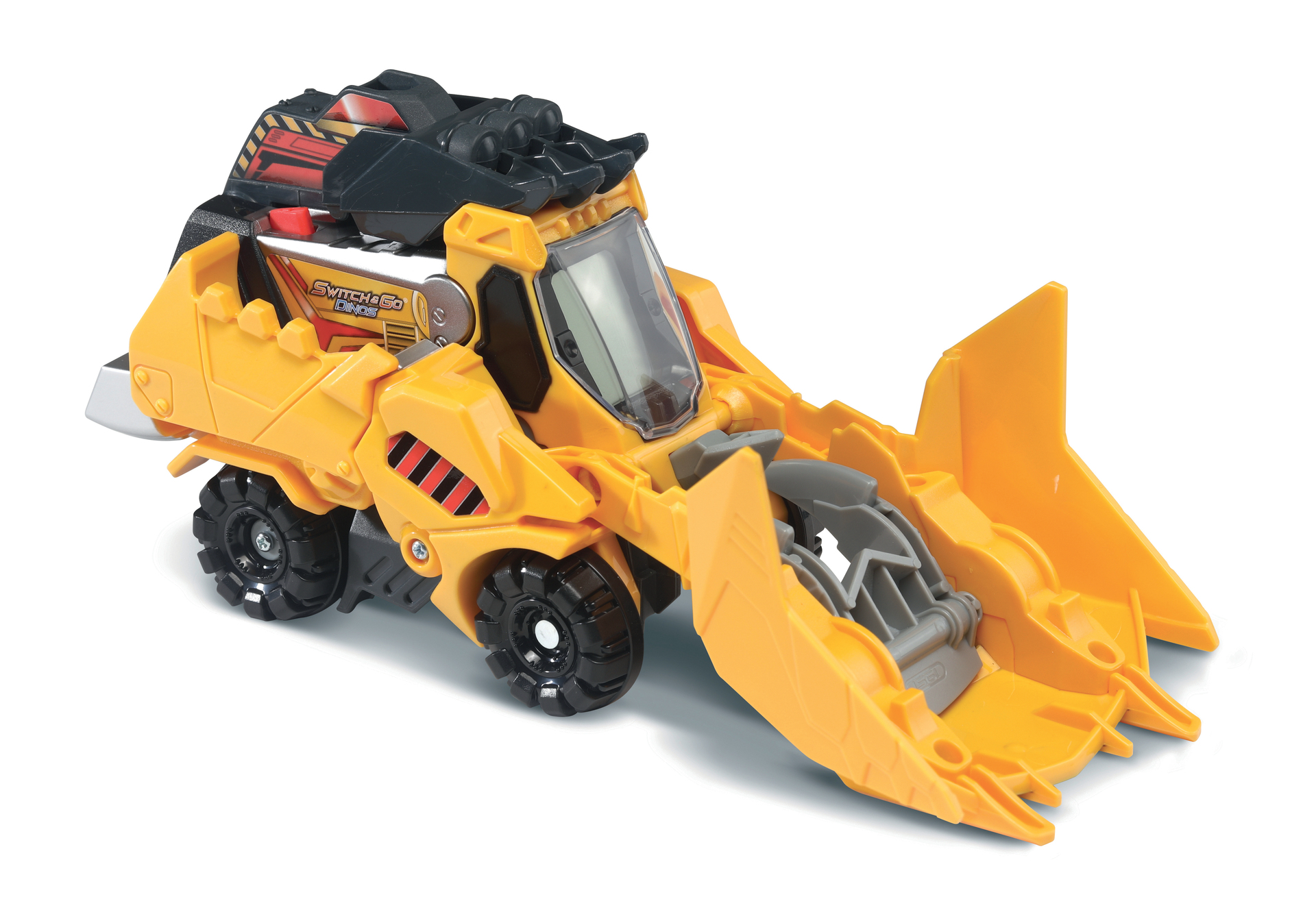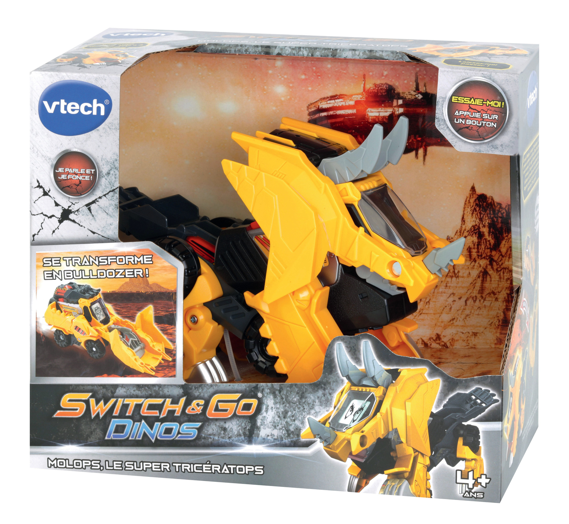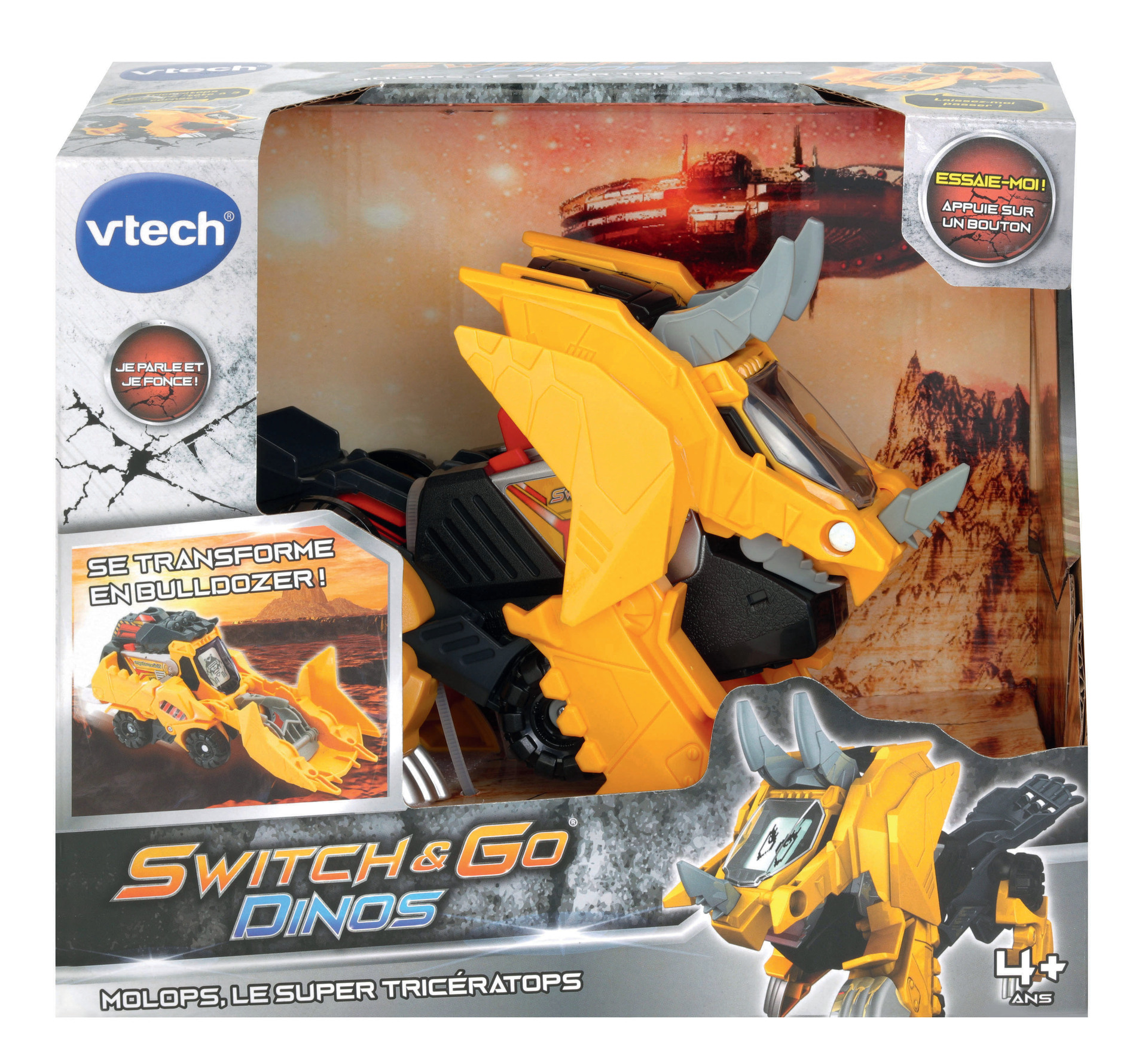 Switch and Go Dinos - Molops, Super Tricératops - 4 ans + Un Tricératops à transformer en super engin de chantier ! Deux modes : mode Véhicule et mode Dino. Chaque mode se déclenche automatiquement lorsque la transformation est effectuée. Écran LCD avec animations : pilote pour le mode voiture et yeux de dino pour le mode dinosaure. Boutons pour déclencher les phrases et les effets sonores et bouton "Action" en mode Dino pour ouvrir la mâchoire du dino. La LED rouge dans la bouche du dino s'éclaire quand il ouvre la mâchoire pour cracher du feu. Avec des sons réalistes, des phrases liées à l’univers des dinos et des effets lumineux. Plus de 60 phrases et effets sonores réalistes. Arrêt automatique. Boîte Try-me. Fonctionne avec 2 piles LR03 fournies.
