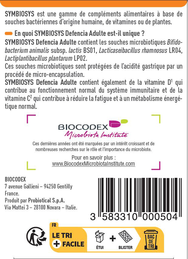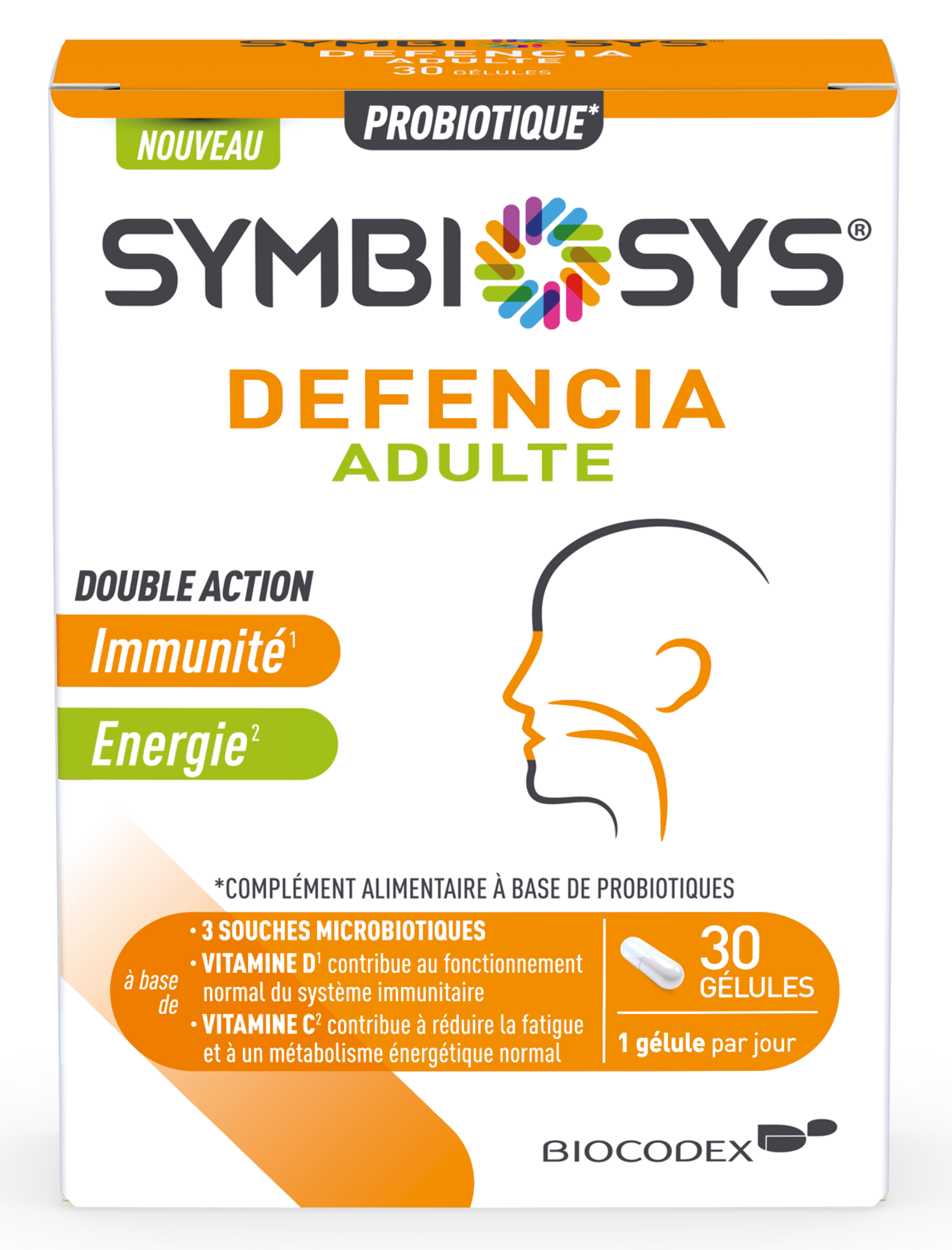 SYMBIOSYS Defencia Adulte est un complément alimentaire destiné à l’adulte, contenant les souches microbiotiques Bifidobacterium animalis subsp. lactis BS01, Lacticaseibacillus rhamnosus LR04, Lactiplantibacillus plantarum LP02, ainsi que de la vitamine D qui contribue au fonctionnement normal du système immunitaire et de la vitamine C qui contribue à réduire la fatigue et à un métabolisme énergique normal. Chaque gélule de SYMBIOSYS Defencia Adulte contient au total 6 milliards de bactéries, 12 mg de vitamine C (soit 15% des VNR*) et 2,5 ?g de vitamine D3 (soit 50% des VNR*). Ces souches microbiotiques sont protégées de l’acidité gastrique par un procédé de micro-encapsulation. *Valeur Nutritionnelle de Référence (conformément au Règlement 1169/2011). Les souches microbiotiques de SYMBIOSYS Defencia Adulte sont déposées dans des collections privées internationales avec statut IDA (International Depositary Authority).