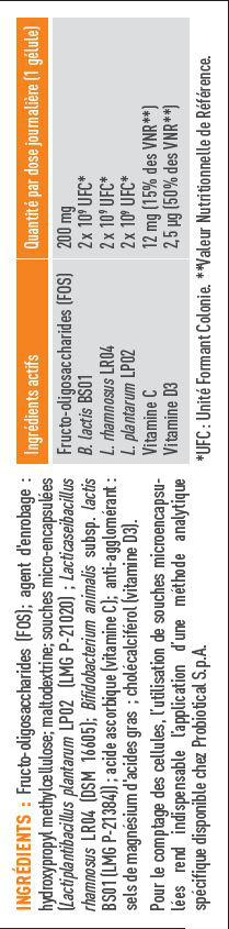 Ingrédients : Fructo-oligosaccharides (fos); agent d'enrobage : hydroxypropyl methylcellulose; maltodextrine; souches micro-encapsulées (lactiplantibacillus plantarum lp02 (lmg p-21020) ; lacticaseibacillus rhamnosus lr04 (dsm 16605); bifidobacterium animalis subsp. lactis bs01 (lmg p-21384)) ; acide ascorbique (vitamine c); anti-agglomérant : sels de magnésium d'acides gras ; cholécalciférol (vitamine d3).