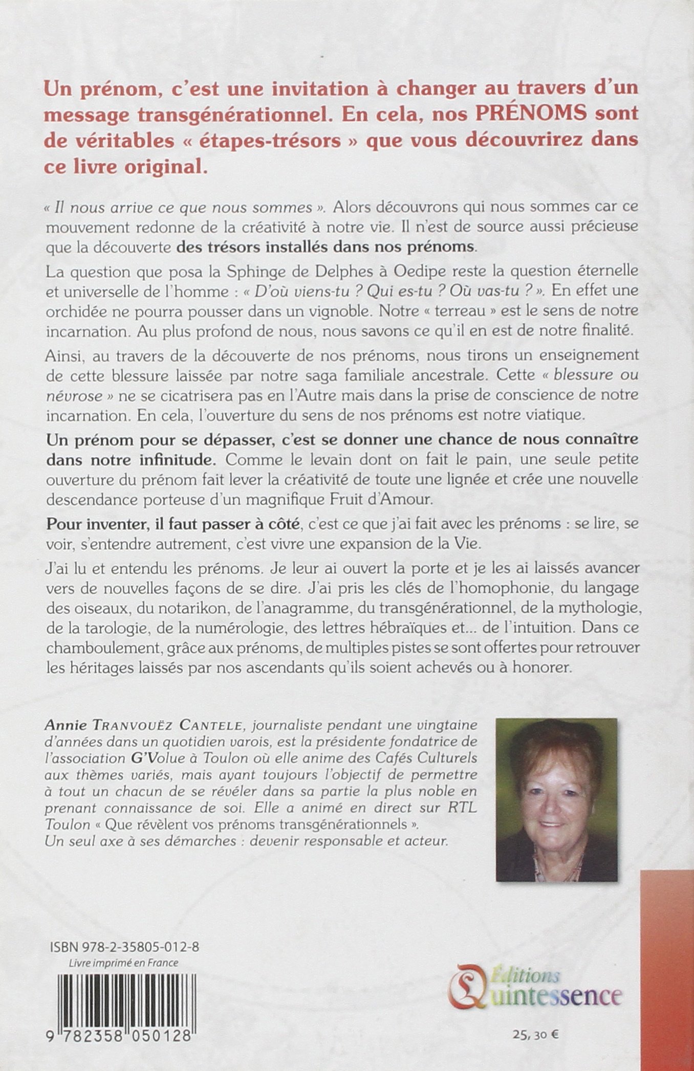 J'ai lu et entendu les prénoms. Je leur ai ouvert la porte et je les ai laissés avancer vers de nouvelles façons de se dire. J'ai pris les clés de l'homophonie, du langage des oiseaux, du notarikon, de l'anagramme, du transgénérationnel, de la mythologie, de la tarologie, de la numérologie, des lettres hébraïques et... de l'intuition. Dans ce chamboulement, grâce aux prénoms, de multiples pistes se sont offertes pour retrouver les héritages laissés par nos ascendants qu'ils soient achevés ou à honorer.