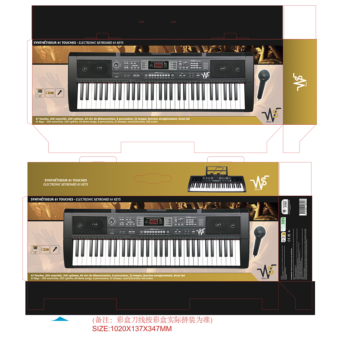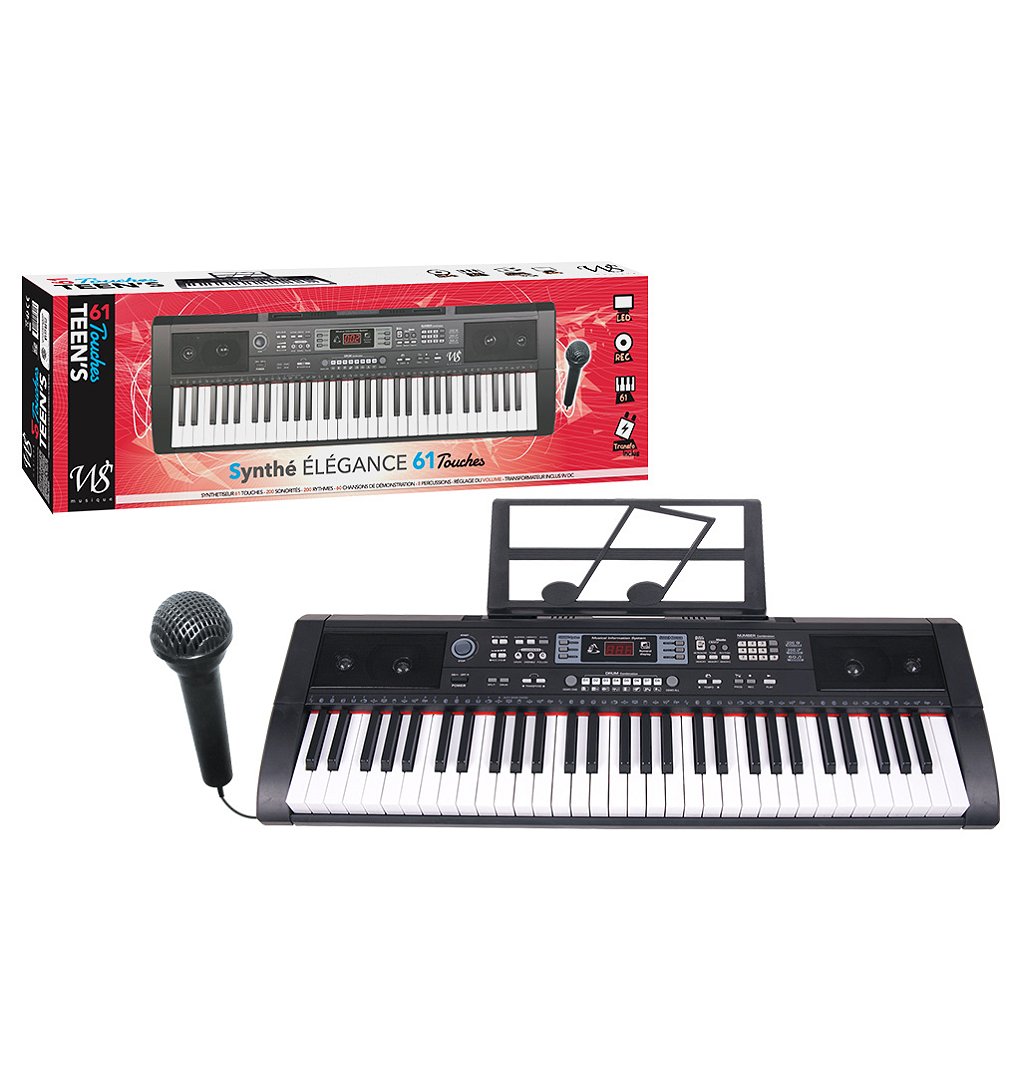 SYNTHE ELEGANCE 61 touches - 200 sonorités, 200 rythmes - 60 chansons de démonstration - 8 Percussions - Volume - Tempo - Métronome - Echo Effet Sonore - Réglage du volume - Fonction enregistrement - Microphone - Ecran Digital - CABLE USB - INPUT 5V- OUTPUT 9V 6PILES NON INCLUSES R6 AA 1.5V