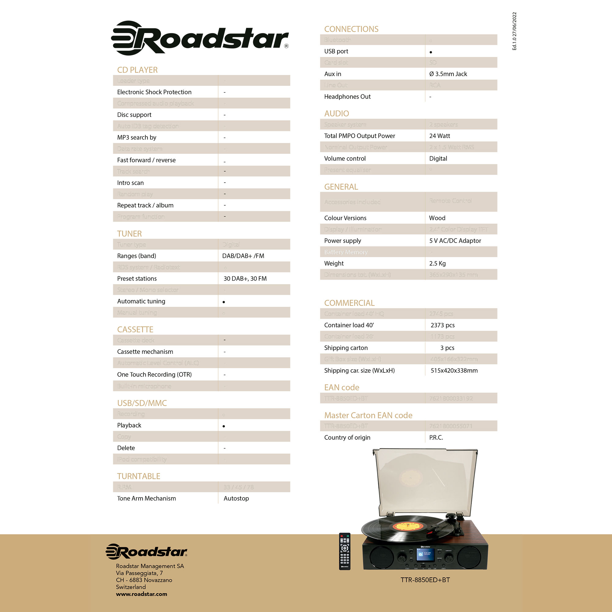 Libellé Système de Musique Hi Fi Platine Vinyle, Radio FM/ DAB+/ RDS, Bluetooth, USB/SD Bois/ Noir RoadstarTTR-8850ED+BT