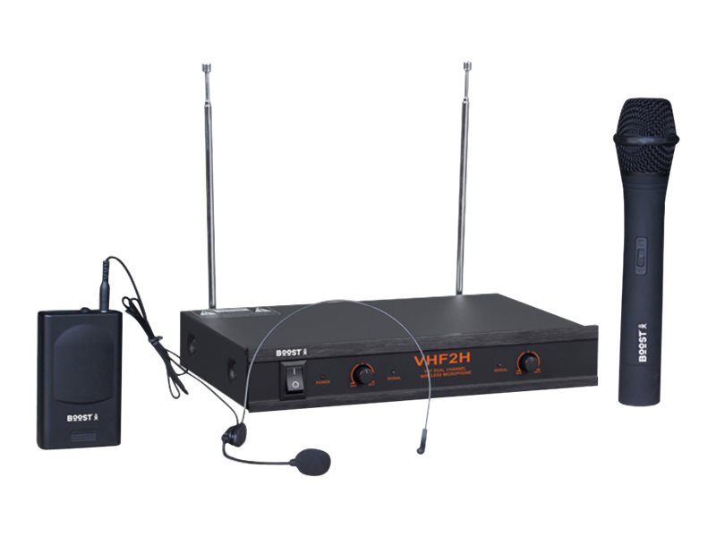Système sans-fil VHF se composant de 2 microphones émetteurs (main et tête) et d'un récepteur. Idéal pour chanteurs, karaoké, présentation, etc. L'émetteur fourni avec le micro tête peut-être utilisé pour une guitare ou autre micro d'un instrument