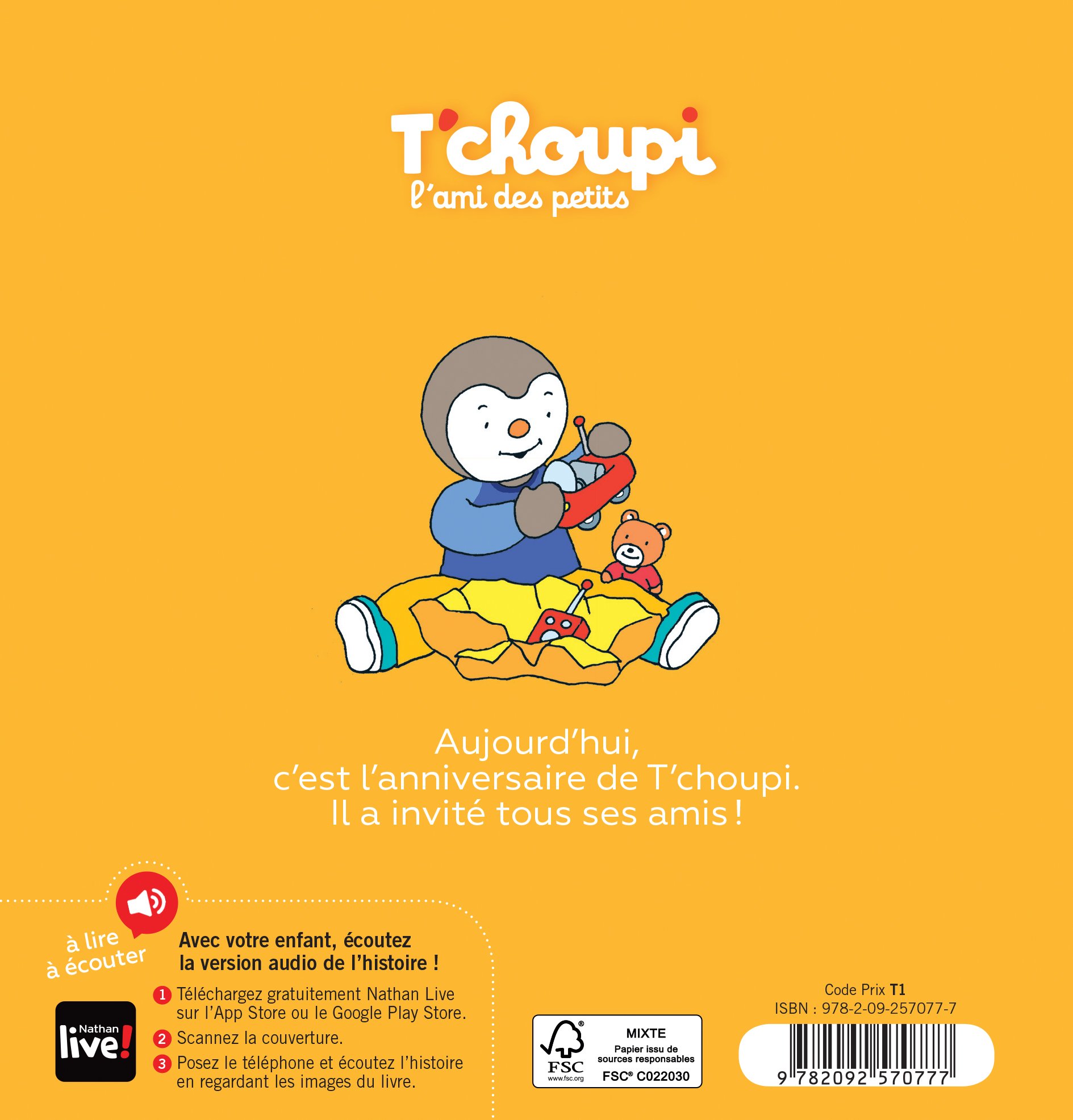Nouveau : avec votre enfant écoutez la version audio de l'histoire ! Tous les albums T'choupi sont maintenant accompagnés d'une version audio, accessible gratuitement en scannant la couverture avec l'application Nathan Live.