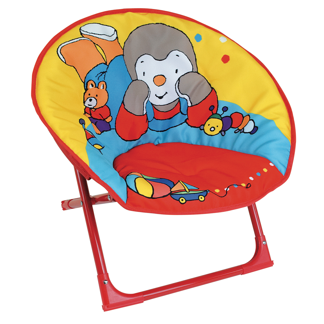 Siège lune T Choupi. Dimensions produit déplié : L 54 x P 42 x H 47 cm. Tissu 100% polyester, armature en acier et parties plastique en polyéthylène.