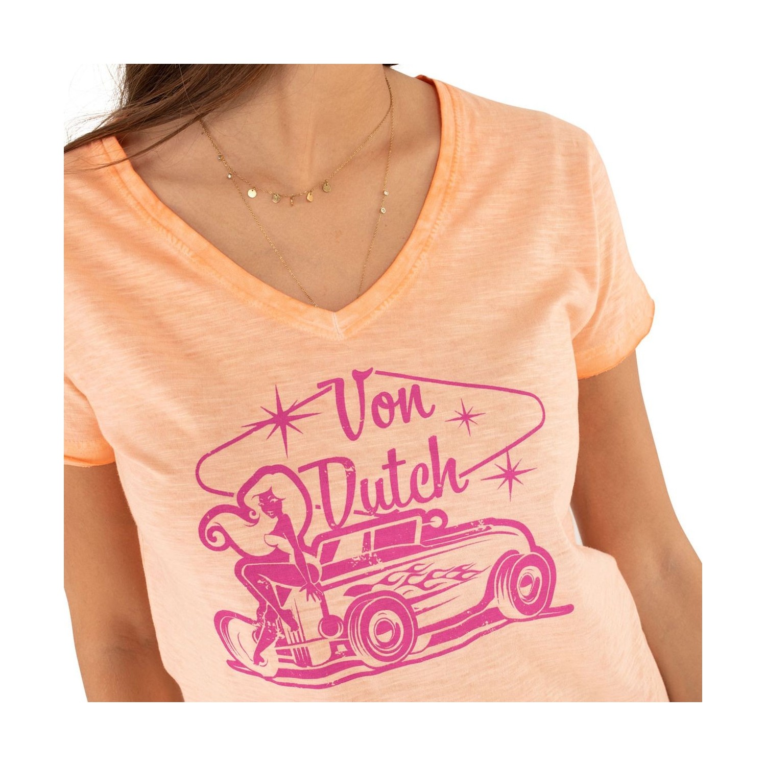 Le Tee Shirt Femme Hot Von Dutch est un vêtement pour femme confortable et doux, fabriqué en coton de qualité supérieure. Il existe en 2 couleurs orange et rose et possède un col v échancré et des manches courtes. Il est disponible en tailles XS S, M, L, et XL, et offre une coupe droite regular.