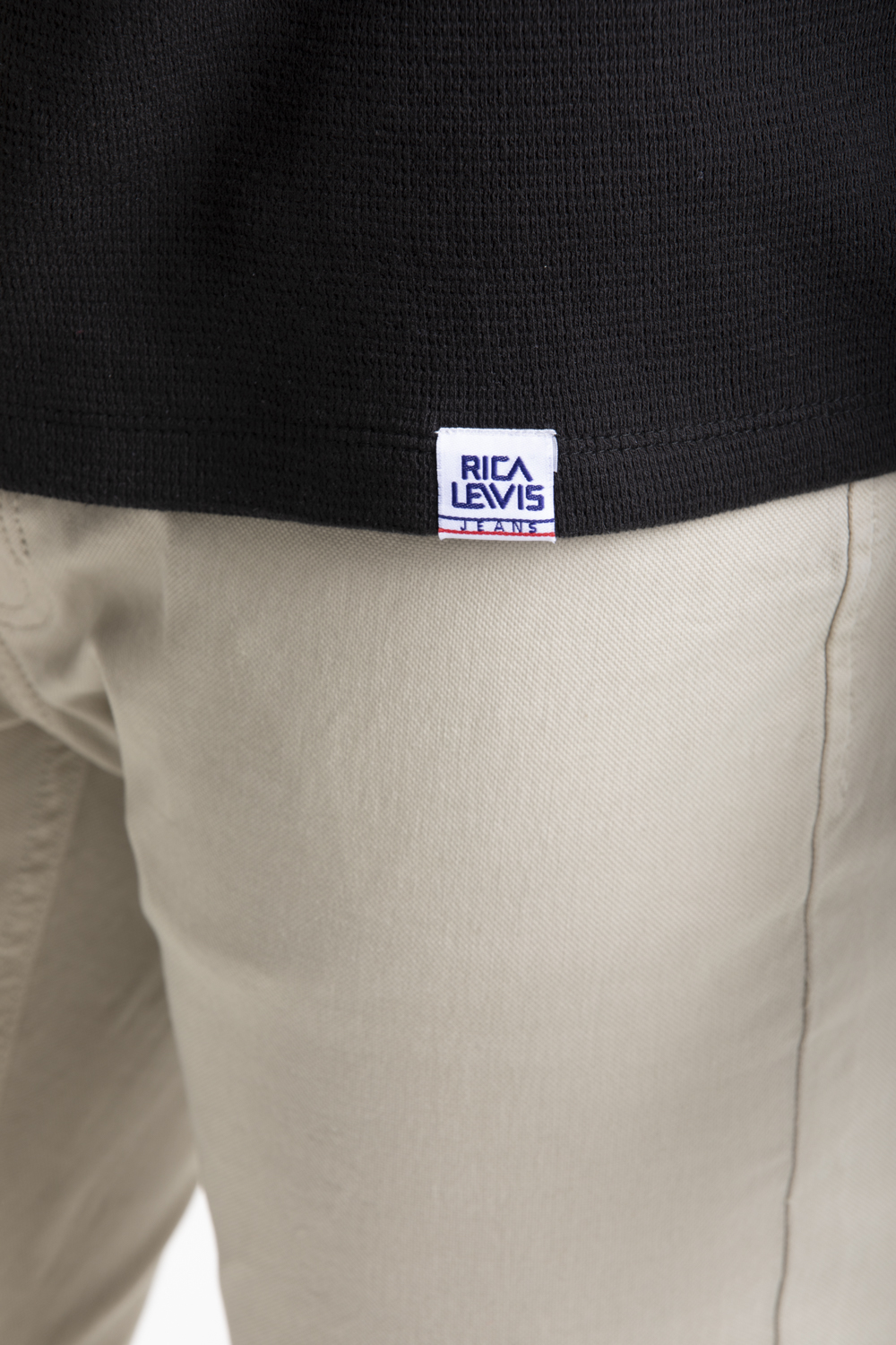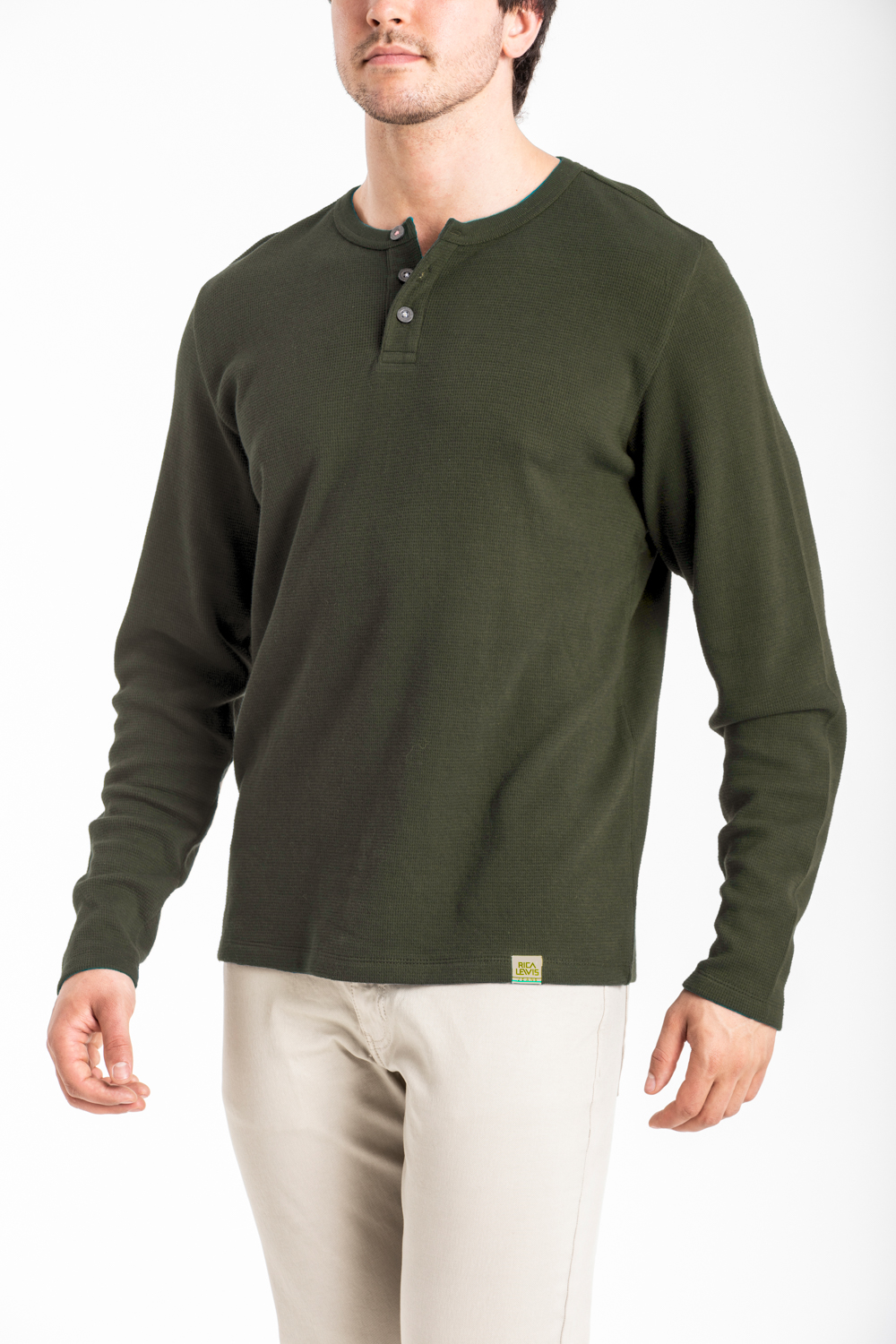T-shirt manches longues, col rond boutonné, coupe regular, tissus armuré nid d'abeille, bande de propreté rayée au col, demi-lune en chambray, petite etiquette tissée en bas de vêtement. 100% coton. Le mannequin porte une taille L.