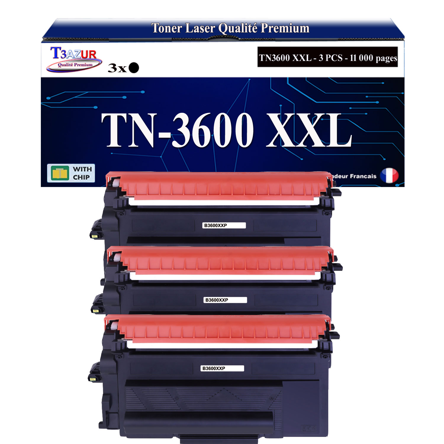 Remplacent les Toners Brother TN3600 XXL - Capacité: 11 000 pages avec un rendement de 5% , repondent à toutes les normes européennes ISO 9001/14001, STMC, CE, ROHS - 100% Compatible - Encre de haute qualité qui garantie une excellence qualité d'impression - Marque T3AZUR