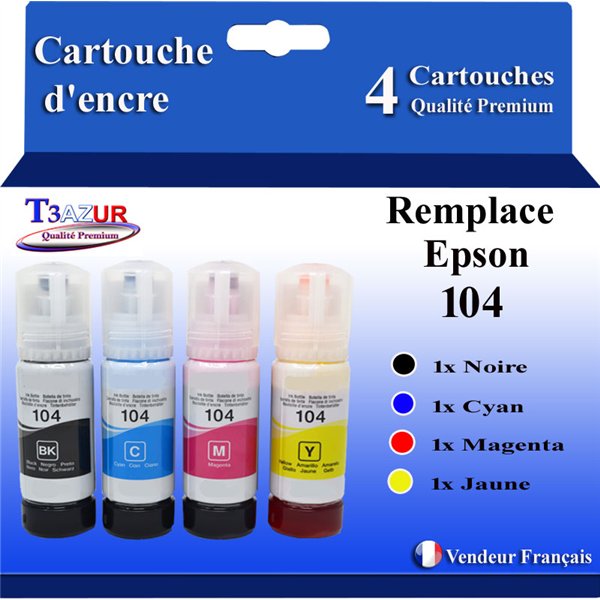 Remplacent les Bouteilles compatibles Epson 104 - Ce lot comprend: 1 Noire + 1 Cyan + 1 Magenta + 1 Jaune - Volume: Noire: 70ml + Couleur: 70ml avec un rendement de 5% , repondent à toutes les normes européennes ISO 9001/14001, STMC, CE, ROHS - 100% Compatible - Encre de haute qualité qui garantie une excellence qualité d'impression - Marque T3AZUR