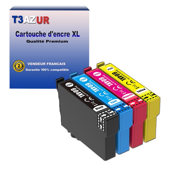 Remplacent les Epson 604 XL Noire, Cyan, Magenta, Jaune - Capacité: 550 pages + 500 pages avec un rendement de 5% , repondent à toutes les normes européennes ISO 9001/14001, STMC, CE, ROHS . Encre de haute qualité qui garantie une excellence qualité d'impression – Vendeur Français – Garantie 100 % compatibles – Marque T3AZUR