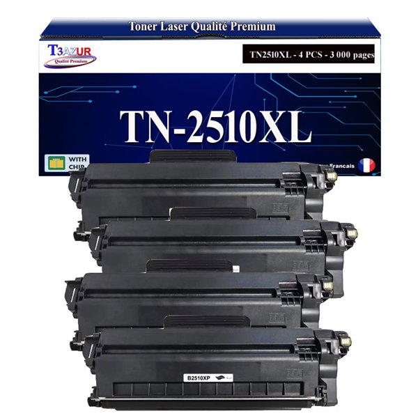 Remplacent les toners Brother TN2510 XL - Ce lot comprend: 4 Noires - Capacité: 3 000 pages avec un rendement de 5% , repondent à toutes les normes européennes ISO 9001/14001, STMC, CE, ROHS - 100% Compatible - Encre de haute qualité qui garantie une excellence qualité d'impression - Marque T3AZUR
