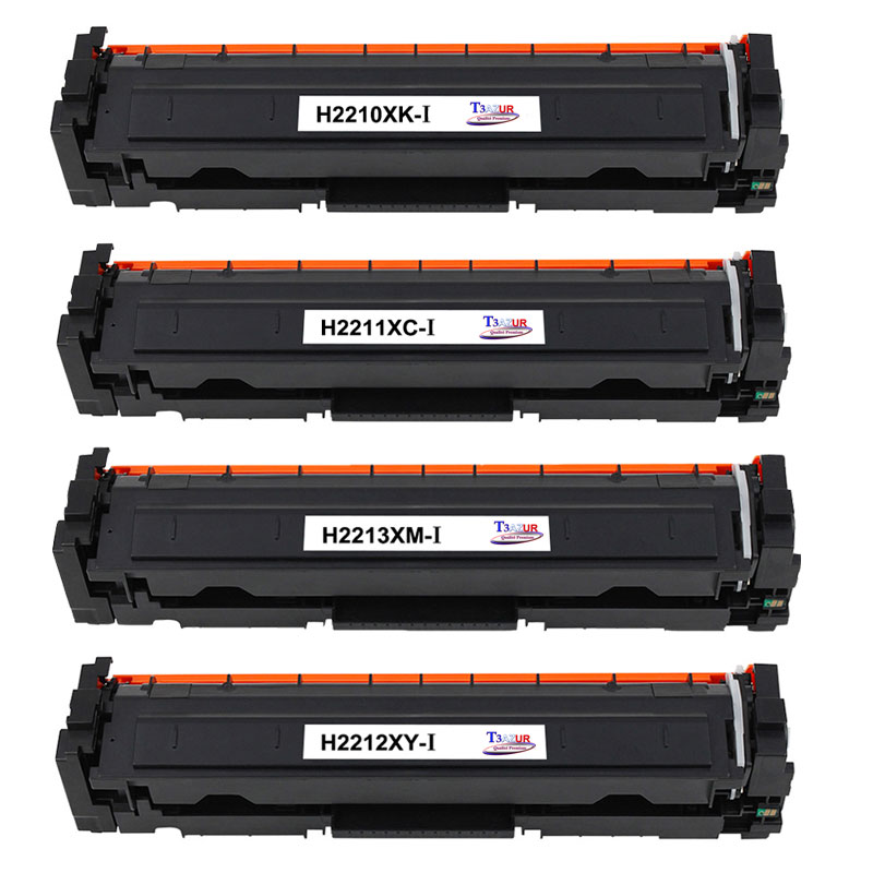 Remplacent les Toner HP W2210/1/2/3X - Ce lot comprend: 1Noir + 1Cyan + 1Magenta + 1Jaune - Capacité: Noir: 3 150 pages + Couleur: 2 450 pages avec un rendement de 5% , repondent à toutes les normes européennes ISO 9001/14001, STMC, CE, ROHS - 100% Compatible - Encre de haute qualité qui garantie une excellence qualité d'impression - Marque T3AZUR