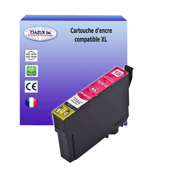 Remplacent les cartouches d'encre Epson T1813/T1803 (18XL) Magenta - Compatible avec l'imprimante Epson Expression Home XP102, XP202, XP205, XP212, XP215, XP225, XP30, XP302, XP305, XP312, XP315, XP322, XP323, XP325, XP402, XP405, XP405WH, XP412, XP415, XP422, XP425- Ce lot comprend: 1 Magenta (13ml) avec un rendement de 5% , repondent à toutes les normes européennes ISO 9001/14001, STMC, CE, ROHS - 100% Compatible - Encre de haute qualité qui garantie une excellence qualité d'impression - Marque T3AZUR