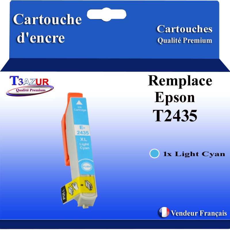 Remplacent les cartouches d'encre Epson T2435 / T2425 Light Cyan - Compatible avec l'imprimante Epson Expression Photo XP-55, XP-750, XP-760, XP-850, XP-860, XP-950, XP-960 - Ce lot comprend: 1 Light Cyan (13ml) avec un rendement de 5% , repondent à toutes les normes européennes ISO 9001/14001, STMC, CE, ROHS - 100% Compatible - Encre de haute qualité qui garantie une excellence qualité d'impression - Marque T3AZUR