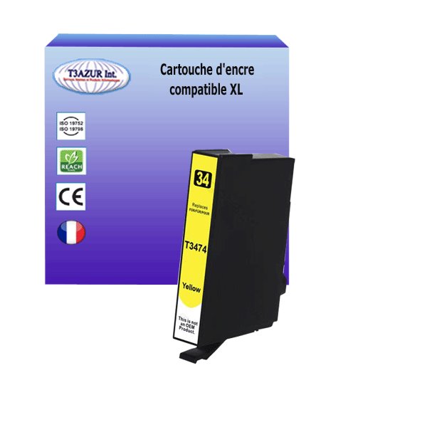 Remplacent les cartouches d'encre Epson T3474 / T3464 (34XL) Jaune - Compatible avec l'imprimante Epson WorkForce Pro WF-3725DWF, WF-3720DW, WF-3720DWF- Ce lot comprend: 1 Jaune (12ml) avec un rendement de 5% , repondent à toutes les normes européennes ISO 9001/14001, STMC, CE, ROHS - 100% Compatible - Encre de haute qualité qui garantie une excellence qualité d'impression - Marque T3AZUR