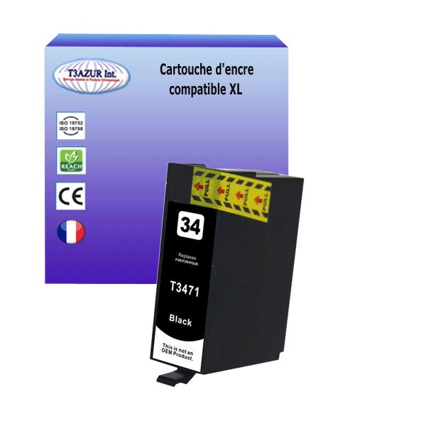 Remplacent les cartouches d'encre Epson T3471 / T3461 (34XL) Noire - Compatible avec l'imprimante Epson WorkForce Pro WF-3725DWF, WF-3720DW, WF-3720DWF- Ce lot comprend: 1 Noire (32ml) avec un rendement de 5% , repondent à toutes les normes européennes ISO 9001/14001, STMC, CE, ROHS - 100% Compatible - Encre de haute qualité qui garantie une excellence qualité d'impression - Marque T3AZUR