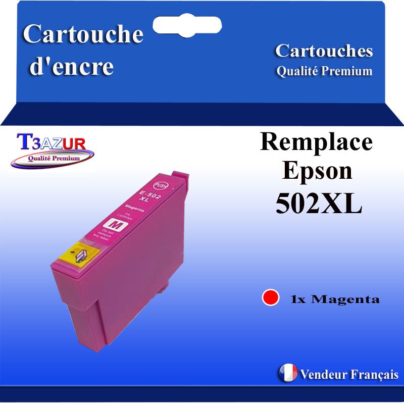 Remplacent les cartouches d'encre Epson 502 XL (série Jumelles) - Ce lot comprend: 1 Magenta - Capacité: 470 pages avec un rendement de 5% , repondent à toutes les normes européennes ISO 9001/14001, STMC, CE, ROHS - 100% Compatible - Encre de haute qualité qui garantie une excellence qualité d'impression - Marque T3AZUR