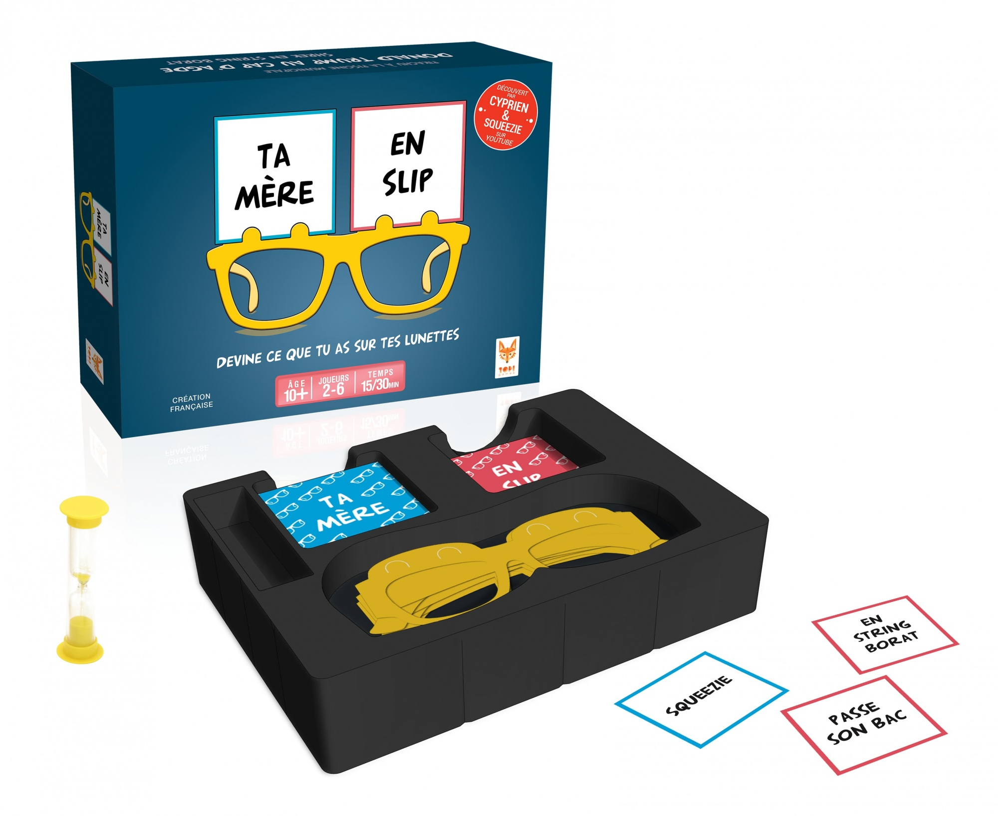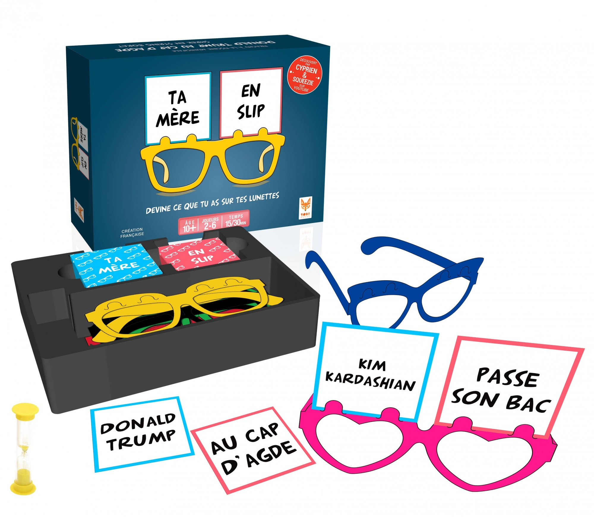 | La boîte contient | – 50 cartes « personnage » – 50 cartes « situation » – 24 cartes vierges pour vos références perso – 6 paires de lunettes – 1 sablier – 1 livret de règles |