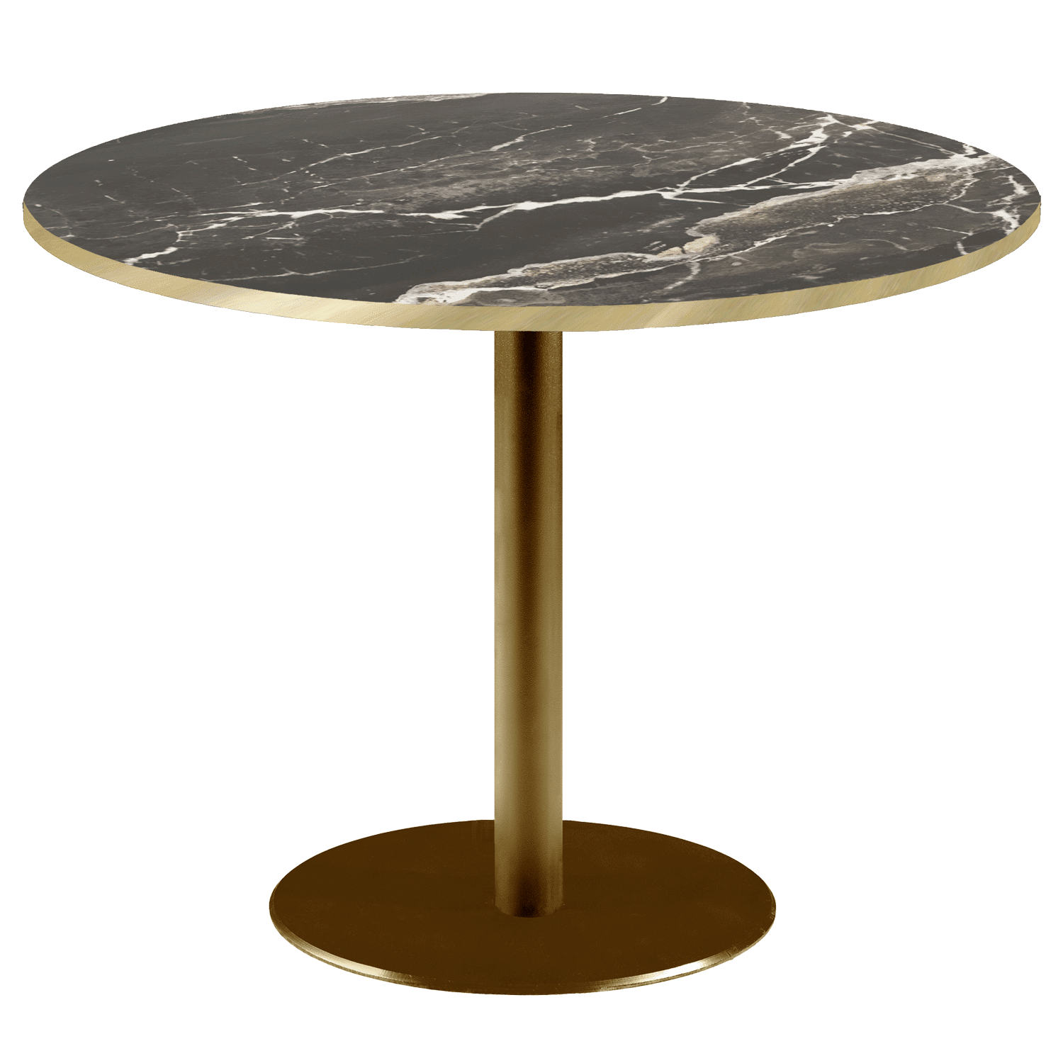 Offrez à votre salle à manger une table design, décor Marbre noir veiné, chants couleur laiton, adaptée à votre espace et à votre style. Avec son plateau rond de Ø120cm, elle peut accueillir 6 à 7 personnes. Sa surface est légèrement texturisée au toucher. Son piétement Doré apportera une touche chic et sophistiquée à votre décoration. Entièrement fabriquée en France et en Italie, cette table présente des matériaux et des finitions de grande qualité. De nombreuses options de coloris et de taille vous sont proposées pour trouver le modèle de vos rêves ! • Table à manger pour 6 à 7 couverts. Usage intérieur exclusif. • Eco-participation incluse, elle est reversée en faveur de la protection de l’environnement. • Plateau en bois aggloméré hydrofuge fabriqué en France, avec placage en stratifié et chants en PVC, face inférieure en mélaminé blanc. Ø120cm, épaisseur 2,9cm. • Piétement Doré en fonte thermolaquée fabriqué en Italie. Base au sol 60x60cm, colonne Ø7,6cm, avec tampons de réglage pour sols irréguliers. • Meuble robuste avec un poids de 41kg et une hauteur standard de 75cm. • Livré en kit, montage facile, visserie fournie. Plateau pré-percé avec inserts pour une parfaite fixation au piétement. • Entretien facile : nettoyage à l'eau légèrement savonneuse ou désinfectant doux, sans détergent ni abrasif. • Cette table existe aussi en 70x70cm, Ø70cm ainsi qu'en mange-debout Ø60cm et 60x60cm. Pour une demande personnalisée, contactez-nous!