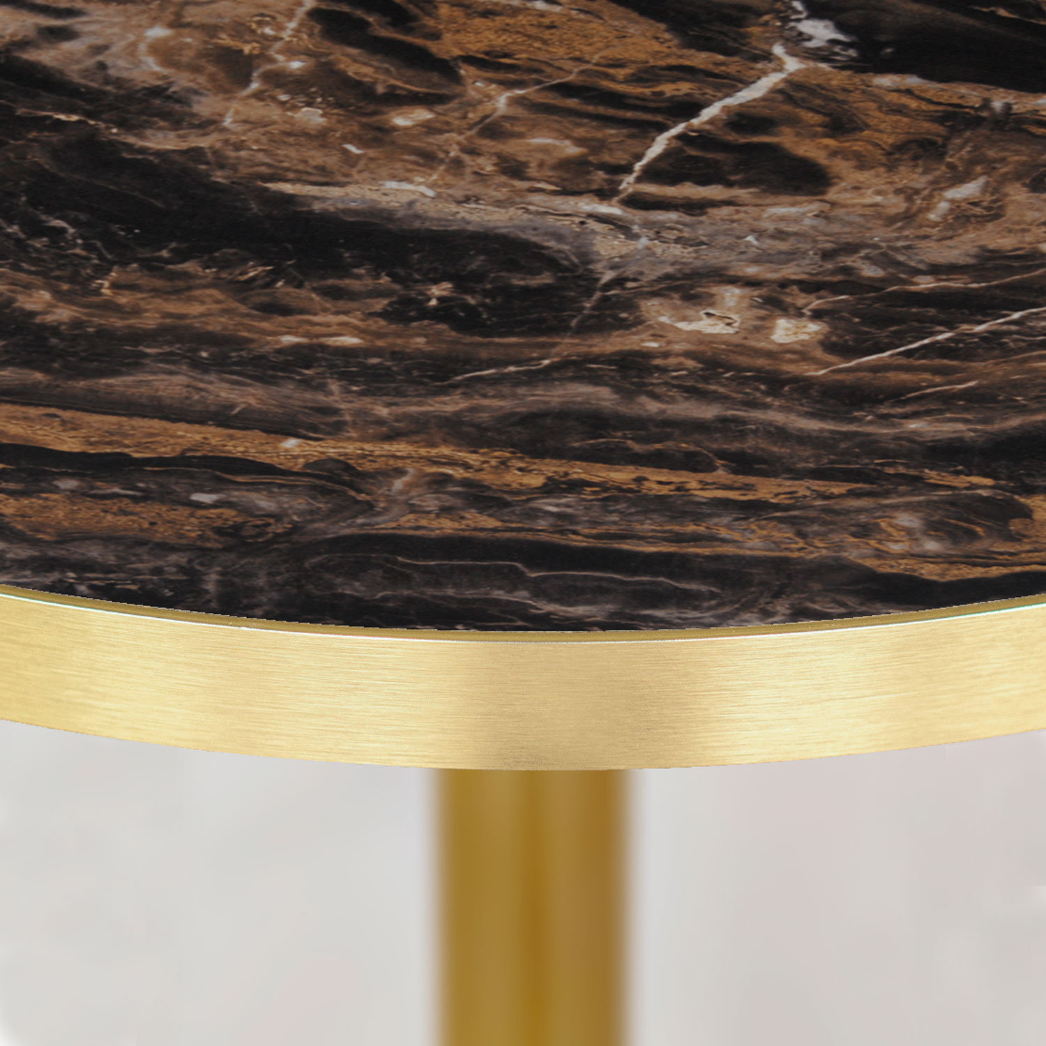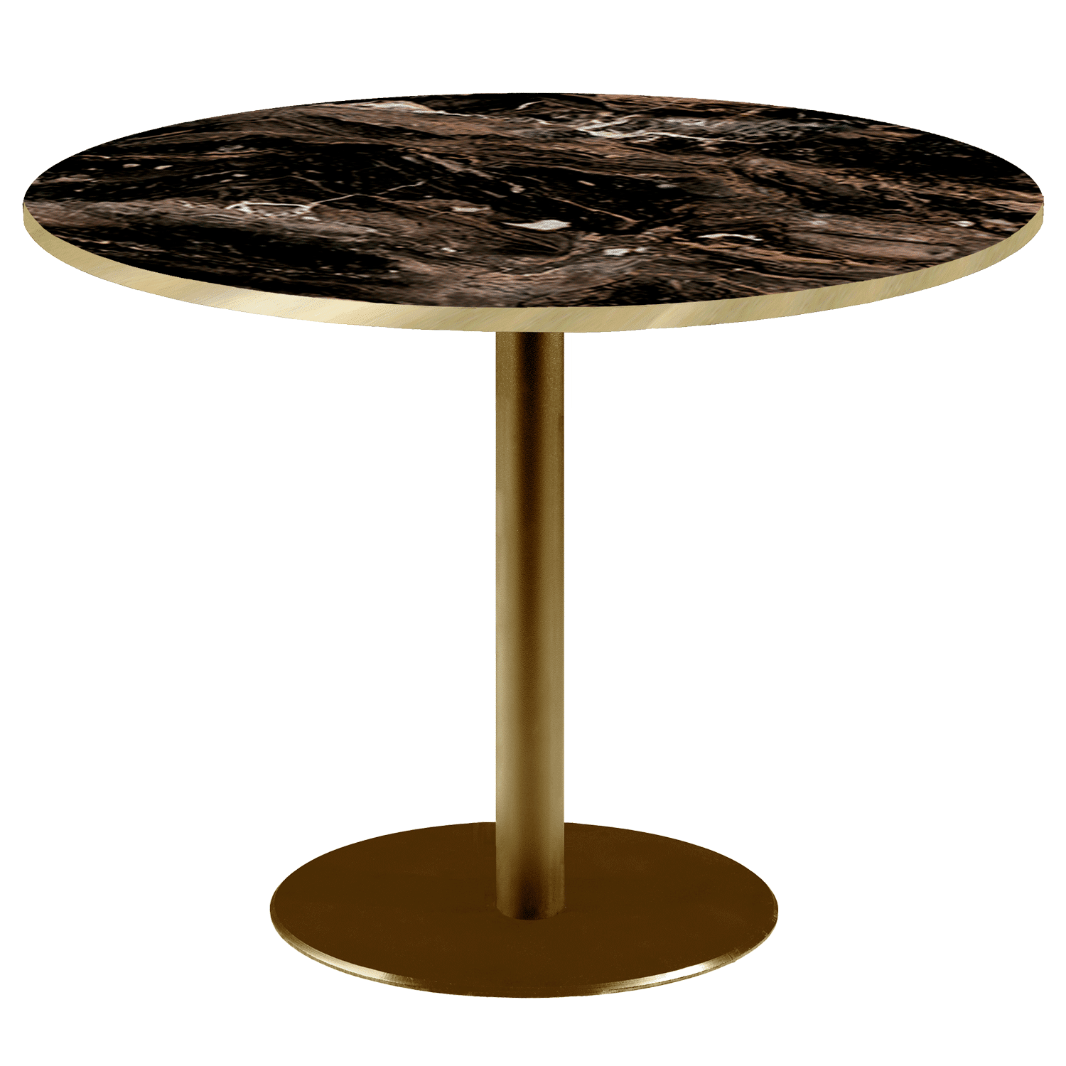 Offrez à votre salle à manger une table design, décor marbré très brillant, chants couleur laiton, adaptée à votre espace et à votre style. Avec son plateau rond de Ø120cm, elle peut accueillir 6 à 7 personnes. Sa surface est lisse au toucher. Son piétement Doré apportera une touche chic et sophistiquée à votre décoration. Entièrement fabriquée en France et en Italie, cette table présente des matériaux et des finitions de grande qualité. De nombreuses options de coloris et de taille vous sont proposées pour trouver le modèle de vos rêves ! • Table à manger pour 6 à 7 couverts. Usage intérieur exclusif. • Eco-participation incluse, elle est reversée en faveur de la protection de l’environnement. • Plateau en bois aggloméré hydrofuge fabriqué en France, avec placage en stratifié et chants en PVC, face inférieure en mélaminé blanc. Ø120cm, épaisseur 2,9cm. • Piétement Doré en fonte thermolaquée fabriqué en Italie. Base au sol 60x60cm, colonne Ø7,6cm, avec tampons de réglage pour sols irréguliers. • Meuble robuste avec un poids de 41kg et une hauteur standard de 75cm. • Livré en kit, montage facile, visserie fournie. Plateau pré-percé avec inserts pour une parfaite fixation au piétement. • Entretien facile : nettoyage à l'eau légèrement savonneuse ou désinfectant doux, sans détergent ni abrasif. • Cette table existe aussi en 70x70cm, Ø70cm ainsi qu'en mange-debout Ø60cm et 60x60cm. Pour une demande personnalisée, contactez-nous!