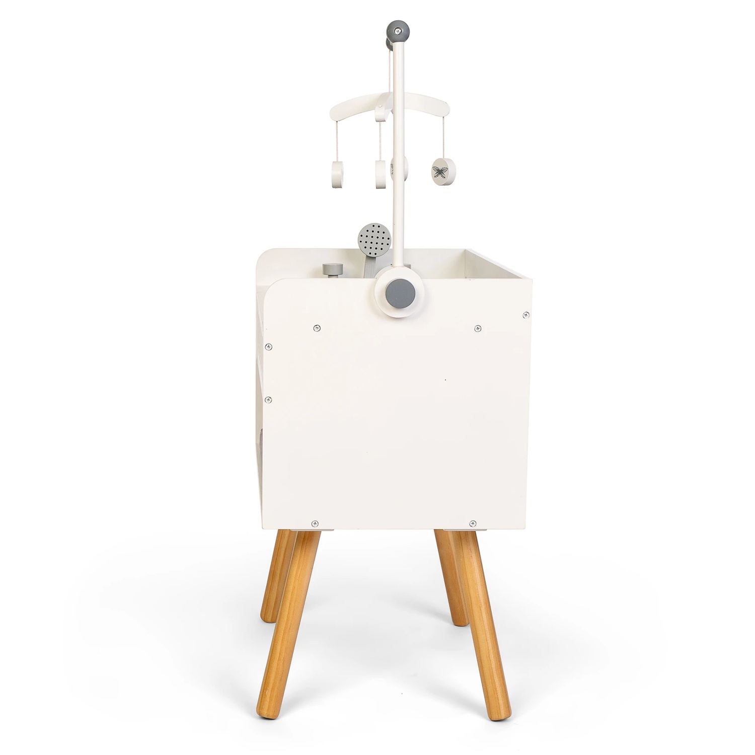 Convient aux poupées jusqu’à 50 cm (poupée non incluse). Table à langer blanche et pieds en bois de hêtre. Hauteur de la table (mobile inclus) = 86 cm.