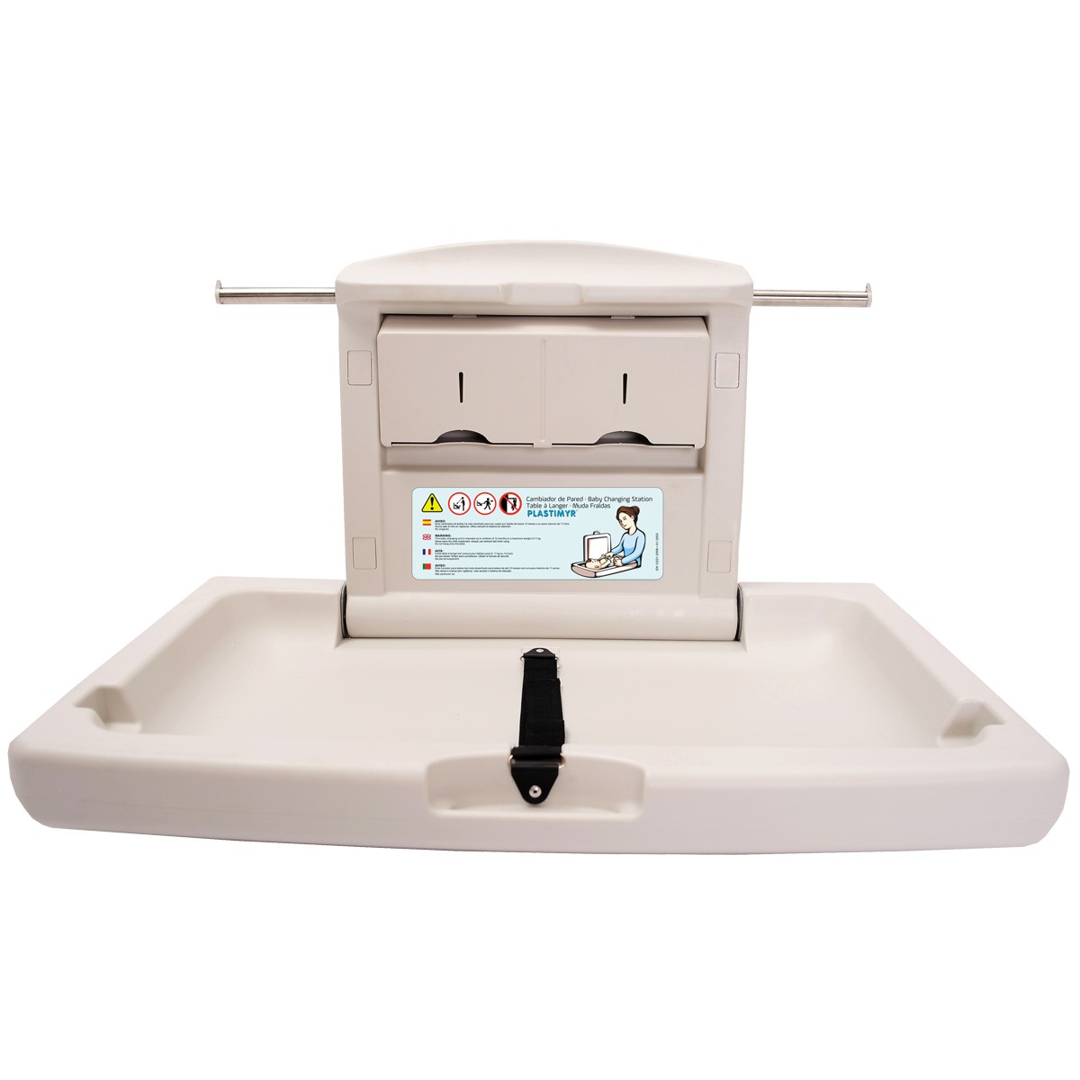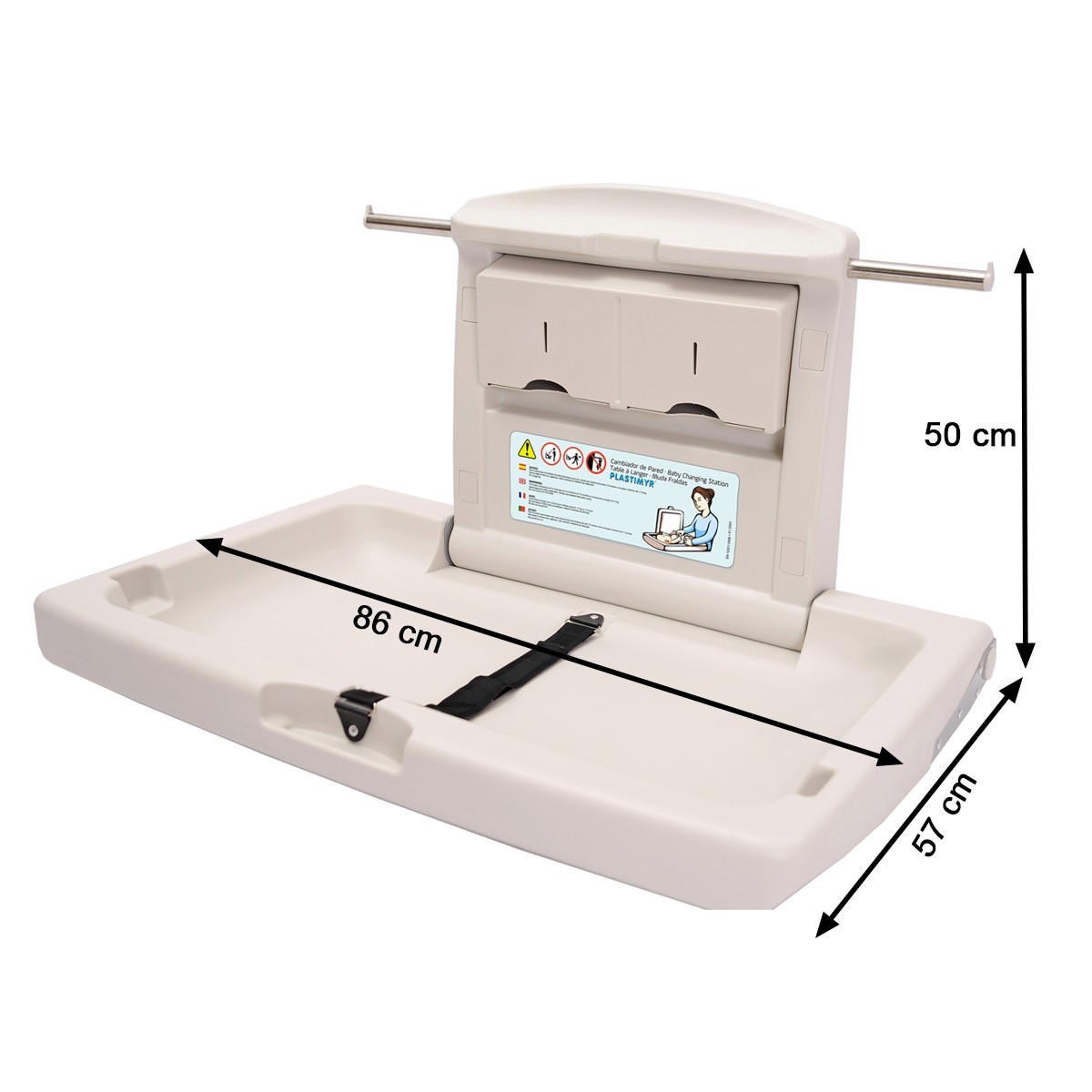 Table à langer professionnelle murale et rétractable pour enfant dès la naissance jusqu'à 1 an, marque PLASTIMYR. Disponible en version horizontale ou verticale. CARACTÉRISTIQUES : Conforme aux normes de sécurité Européenne EN-12221+A1. La table à langer est spécialement adaptée aux établissements recevant du public. Elle est compacte, solide et sécurisante. La structure de la table à langer est constituée d'acier avec un amortisseur à gaz. Les coins de la table à langer sont arrondis. Les précautions d'utilisation sont affichés dans 4 langues (Anglais, Français, Espagnol et Portugais). La table à langer professionnelle supporte un poids maximum jusqu'à 11 kg (12 mois). La table à langer dispose de 2 distributeurs qui permettent de mettre à disposition des alèses à usage unique. La table à langer horizontale comprend deux crochets pour suspendre un sac. Le revêtement de la table à langer contient un traitement antibactérien (certification SGS). MODÈLE HORIZONTAL / DIMENSIONS ET POIDS Dimensions fermées : H. 57 X L. 86 X P. 10 cm. Dimensions ouvertes : H. 50 X L. 86 X P. 57 cm. Poids : 11 kg. MODÈLE VERTICAL / DIMENSIONS ET POIDS Dimensions fermées : H. 88 x L. 48 X P. 12 cm. Dimensions ouvertes : H. 45 X L. 48 X P. 88 cm. Poids : 17 kg. MATIÈRES : Revêtement : Polyéthylène haute densité. Structure : Acier. A NOTER : pas de livraison en Corse ou sur les îles.