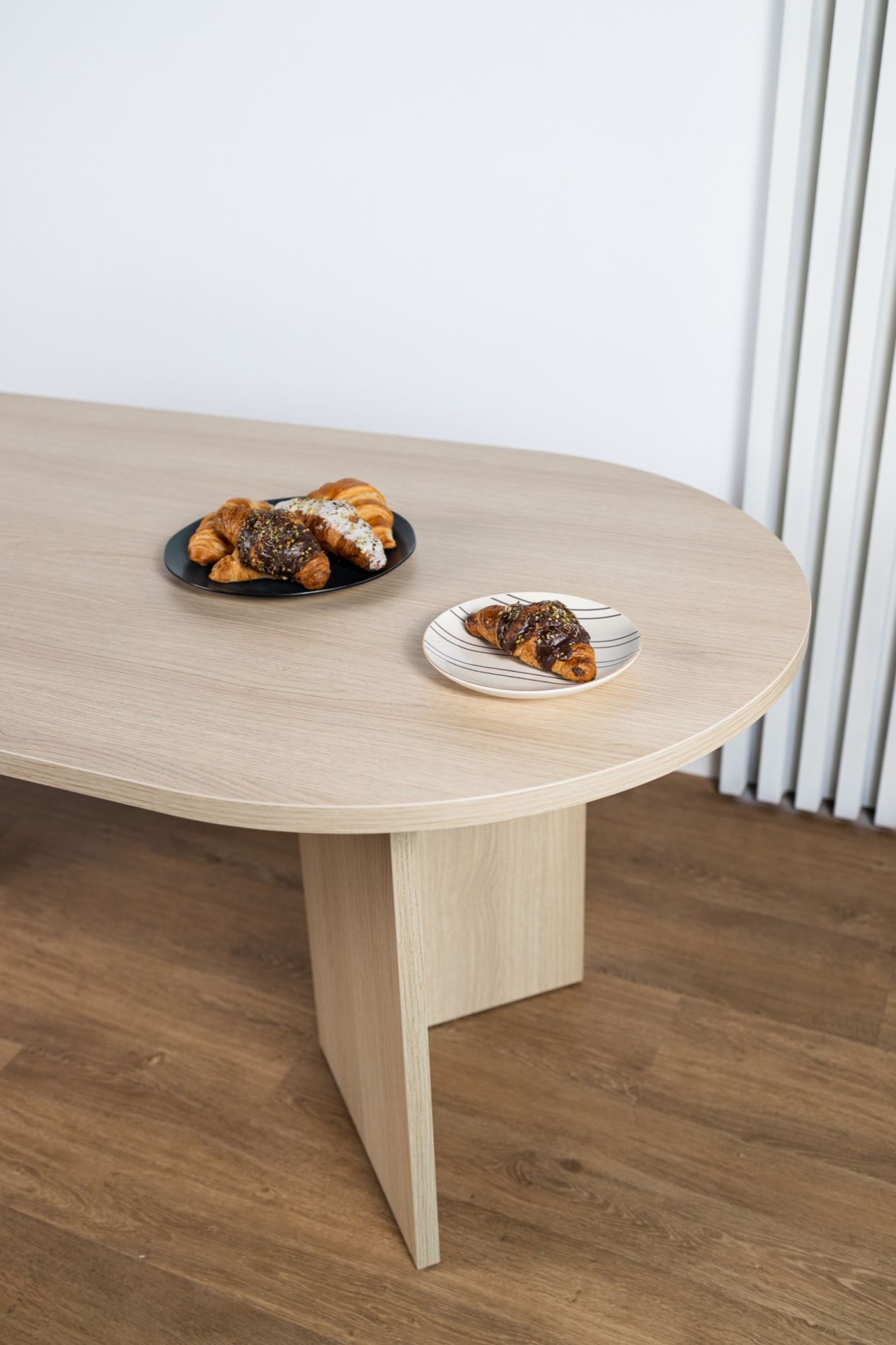 La table OVO peut accueillir jusqu'à dix personnes et s'intègre aussi bien dans une cuisine que dans un salon. Grâce à son design simple et élégant, la table OVO s’adapte à tout type de décoration intérieure. Le plateau en bois chêne présente une surface lisse, facile à entretenir. Les deux pieds en forme de V assurent la stabilité, tandis que des patins protègent le sol contre les rayures.