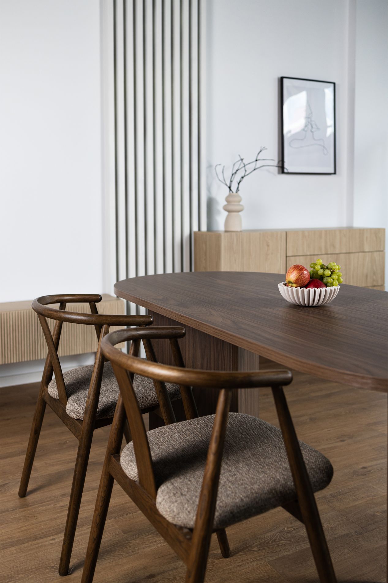 La table OVO peut accueillir jusqu'à dix personnes et s'intègre aussi bien dans une cuisine que dans un salon. Grâce à son design simple et élégant, la table OVO s’adapte à tout type de décoration intérieure. Le plateau en bois noyer Wisconsin présente une surface lisse, facile à entretenir. Les deux pieds en forme de V assurent la stabilité, tandis que des patins protègent le sol contre les rayures.