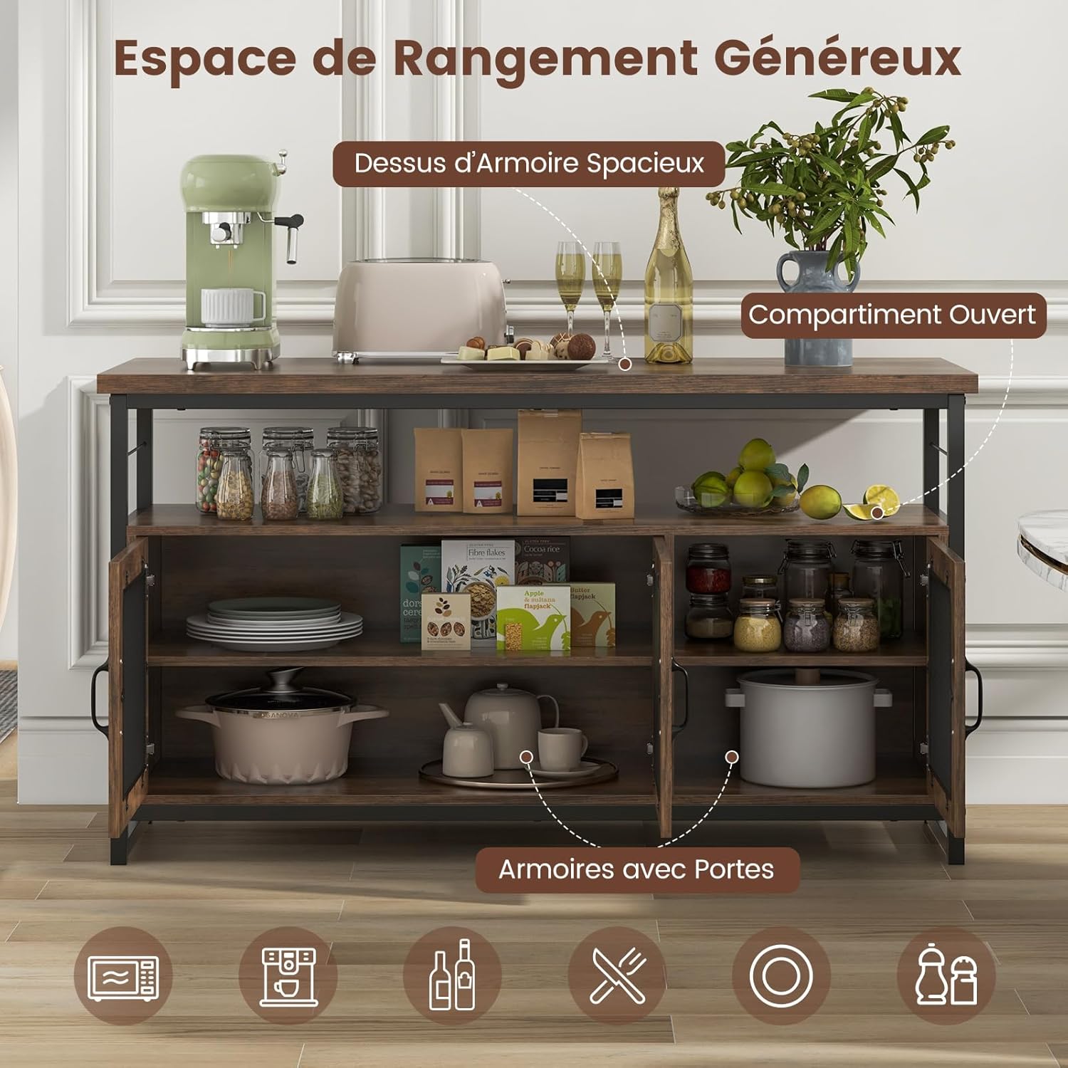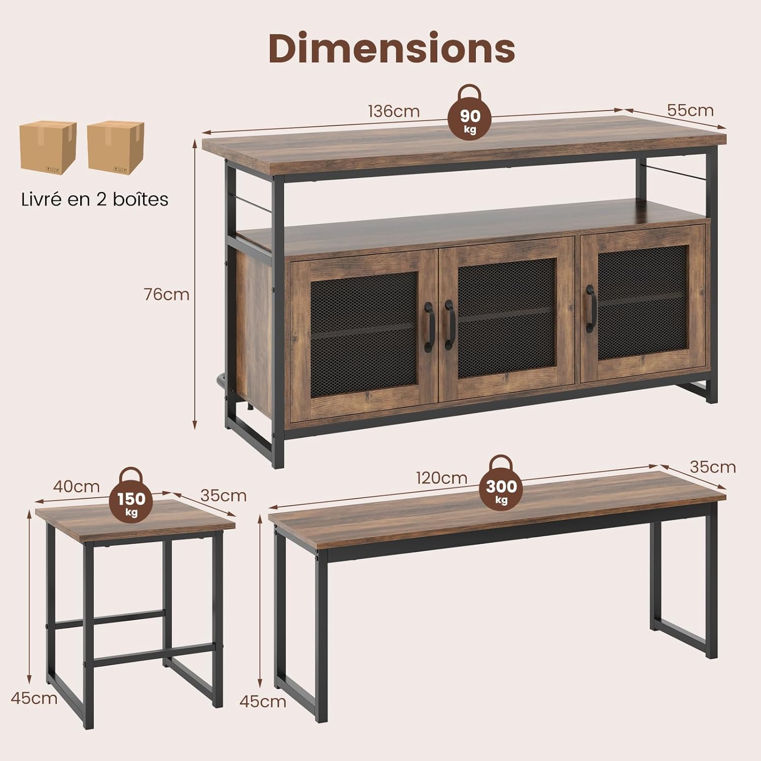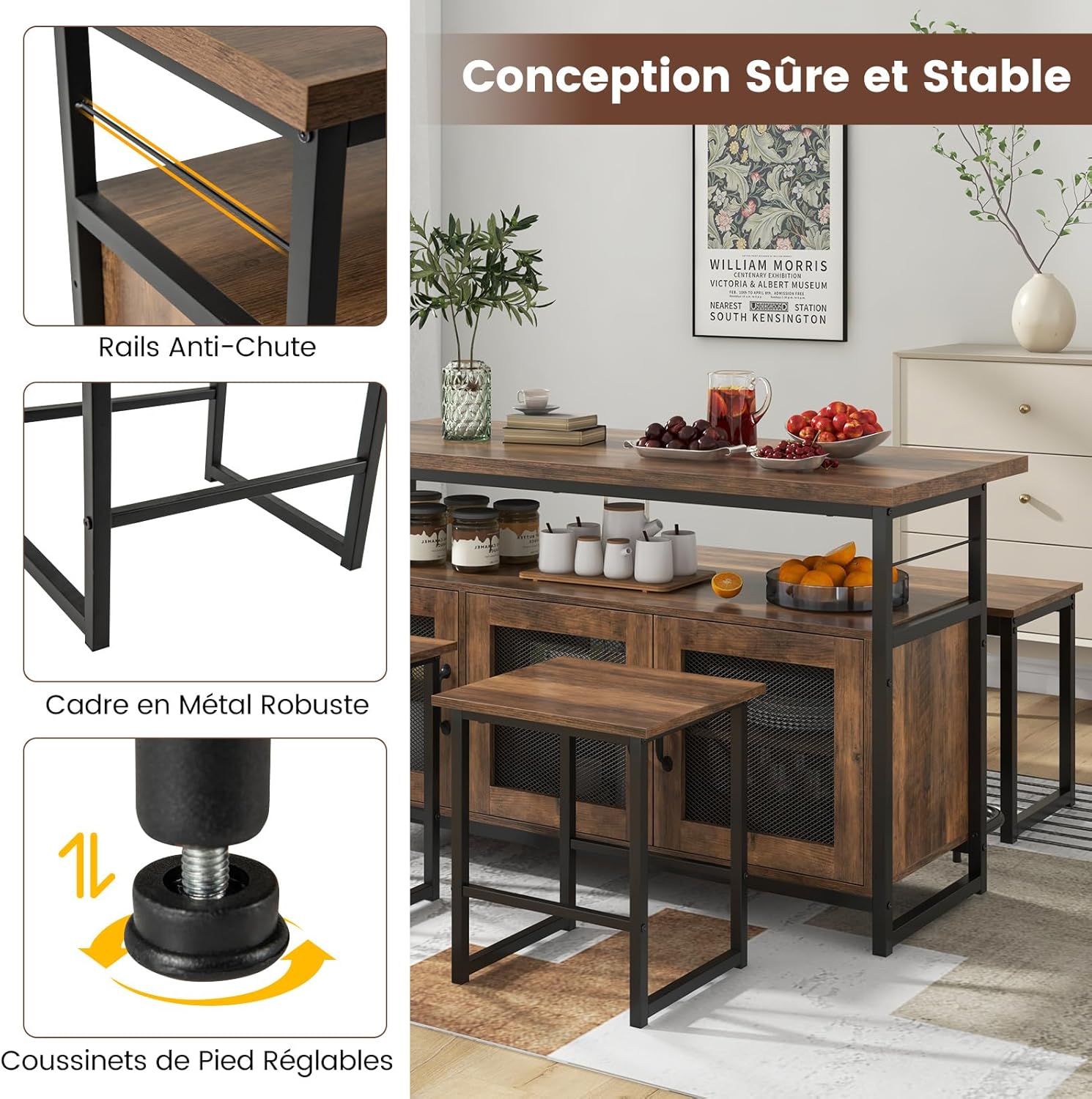 | Libellé | Table à manger avec 2 tabourets et banc, îlot central cuisine avec tabourets, étagères réglables, portes en treillis métallique,marron rustique |