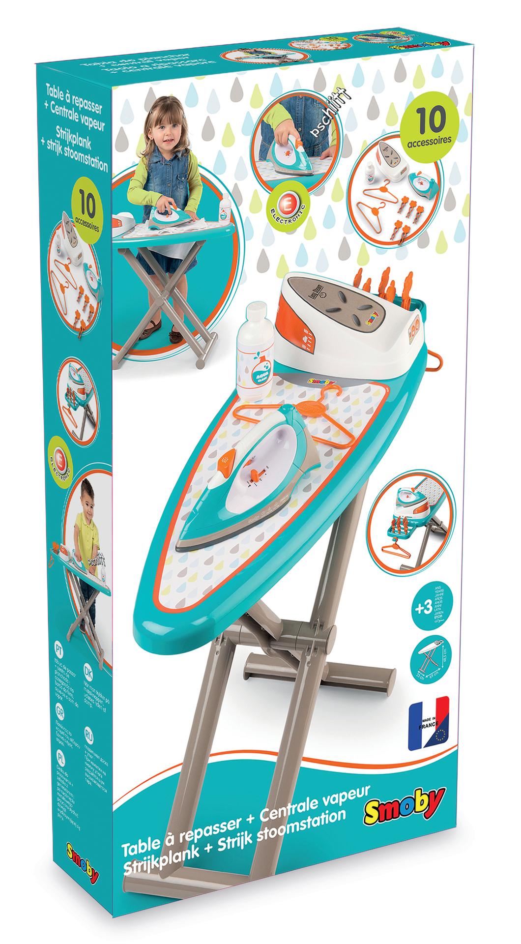 | Plus produit | Planche à repasser pliable avec fer à repasser électronique (bruit de vapeur) et centrale vapeur (bouton cric-cric). 10 accessoires dont 1 centrale. 2 piles LR6 non incluses. |