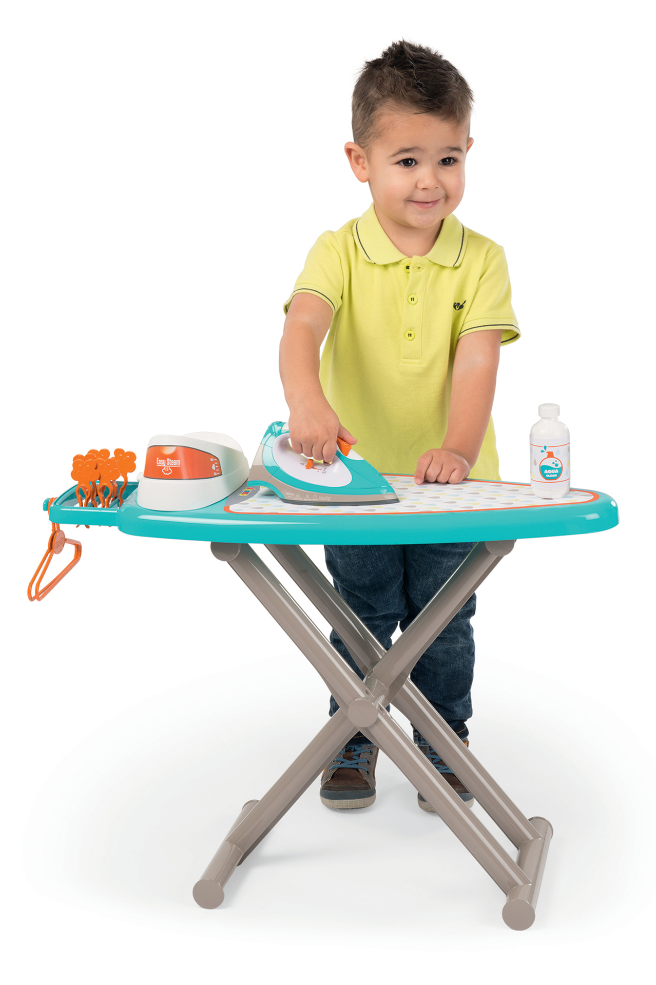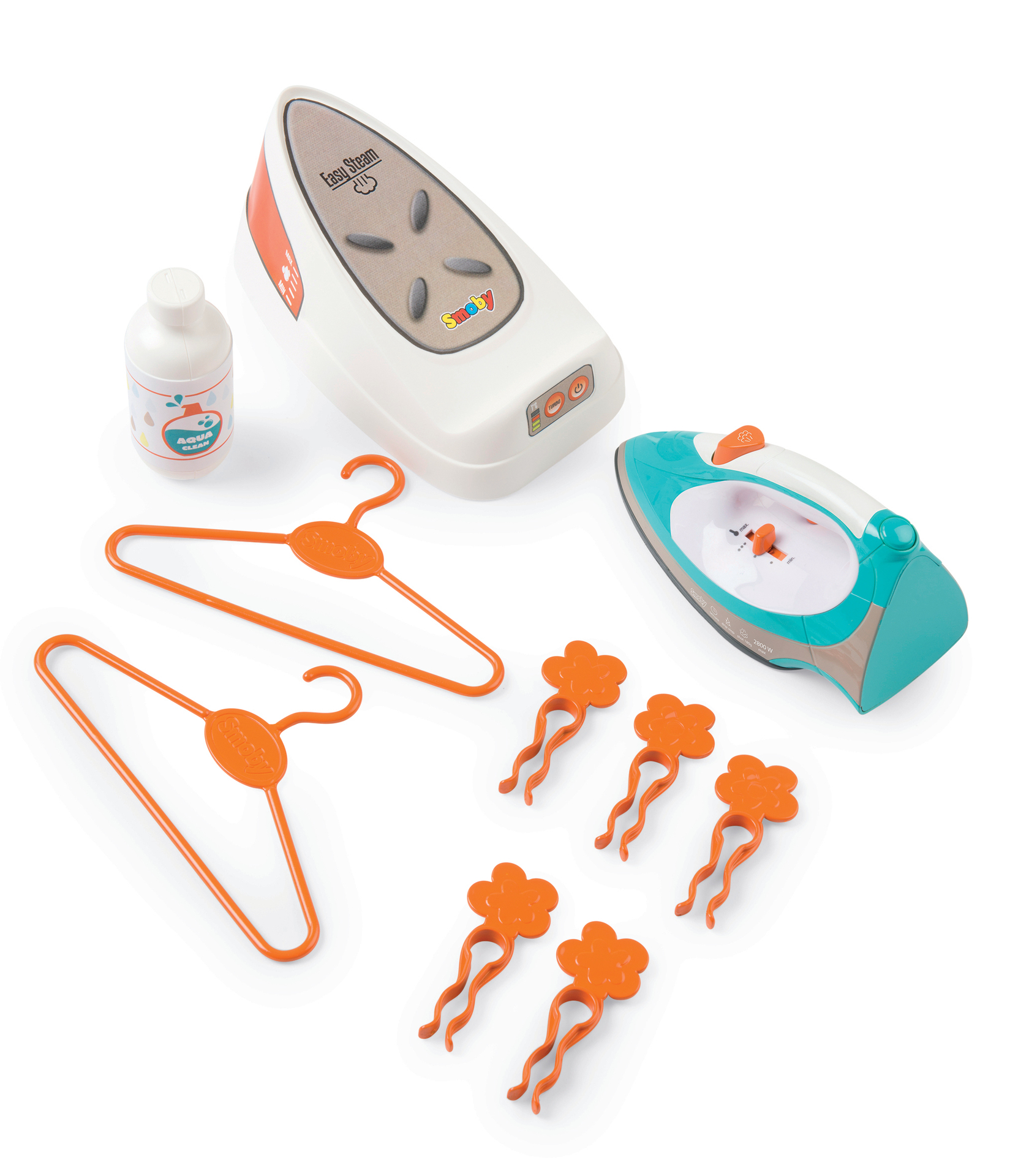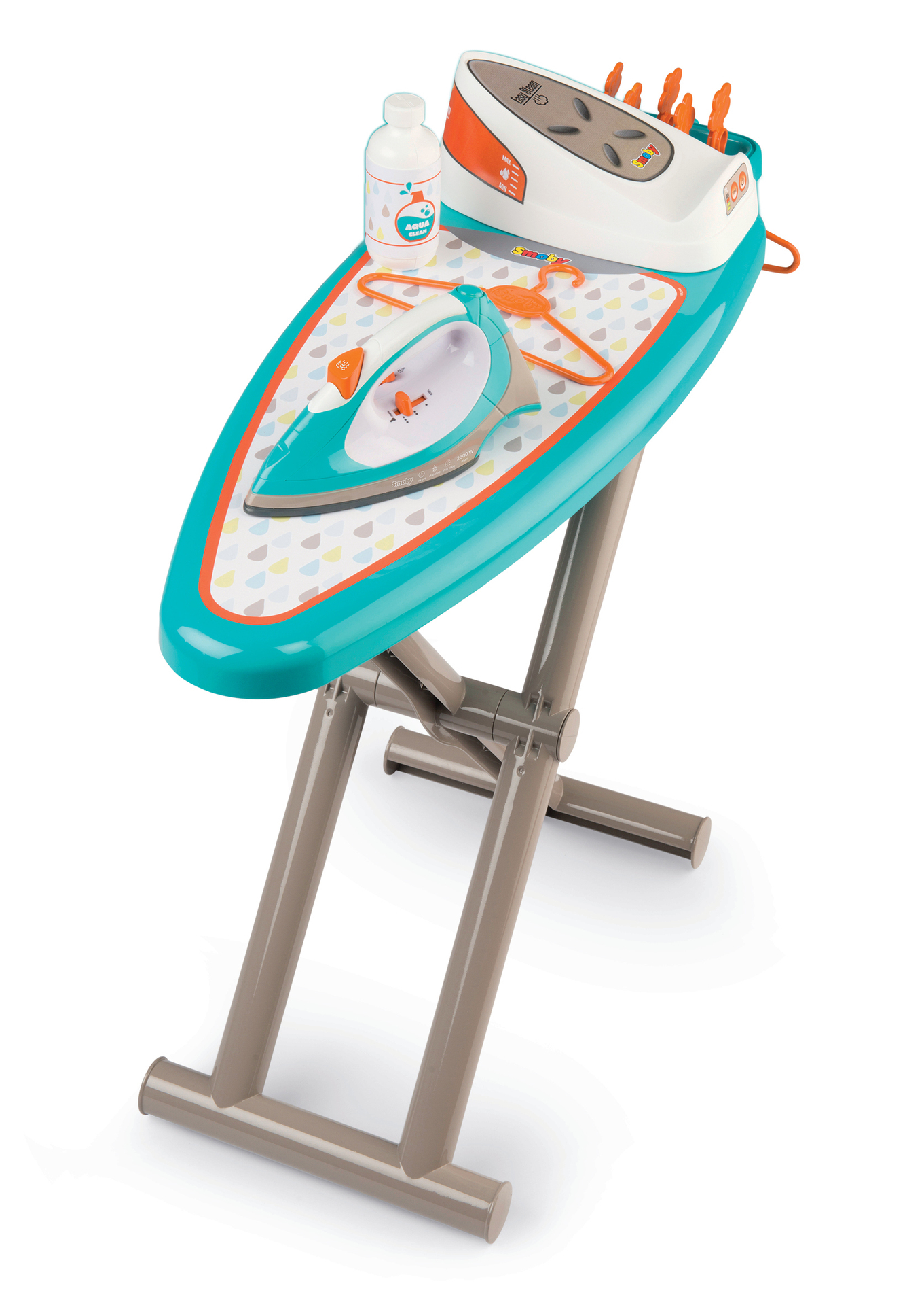1 planche à repasser décorée avec IML, 1 centrale vapeur avec boutons cric-cric et 1 fer à repasser, 2 cintres et 5 pinces à linge .