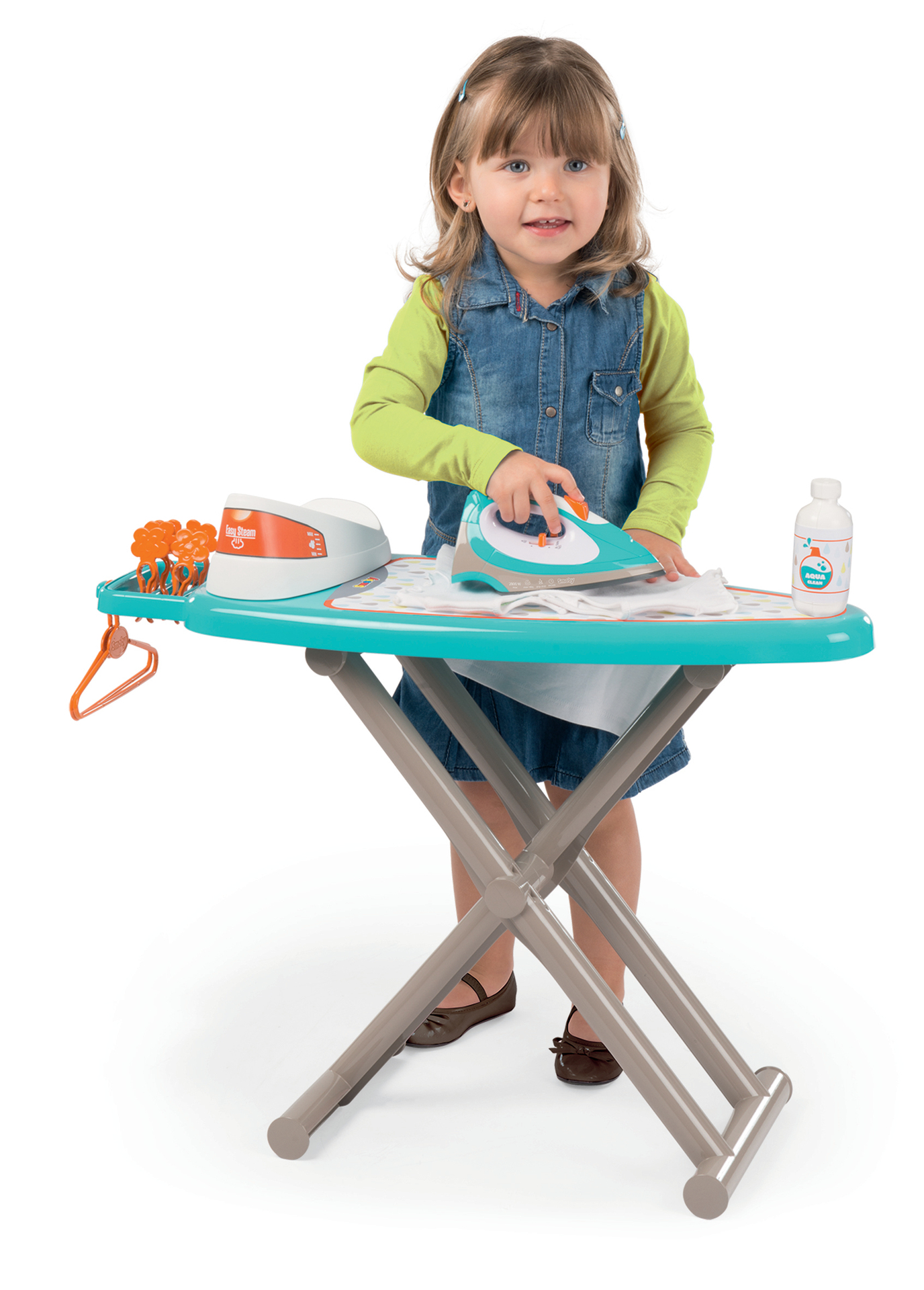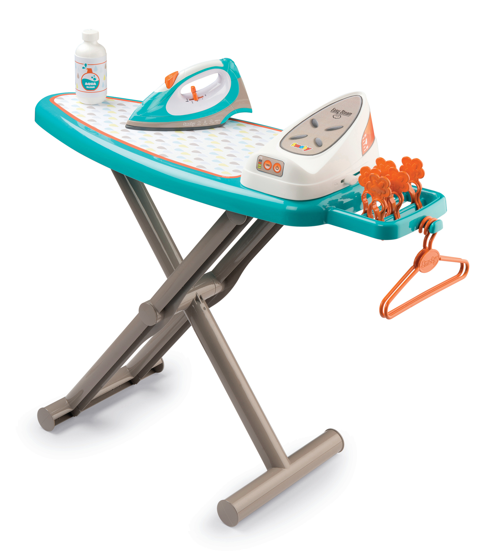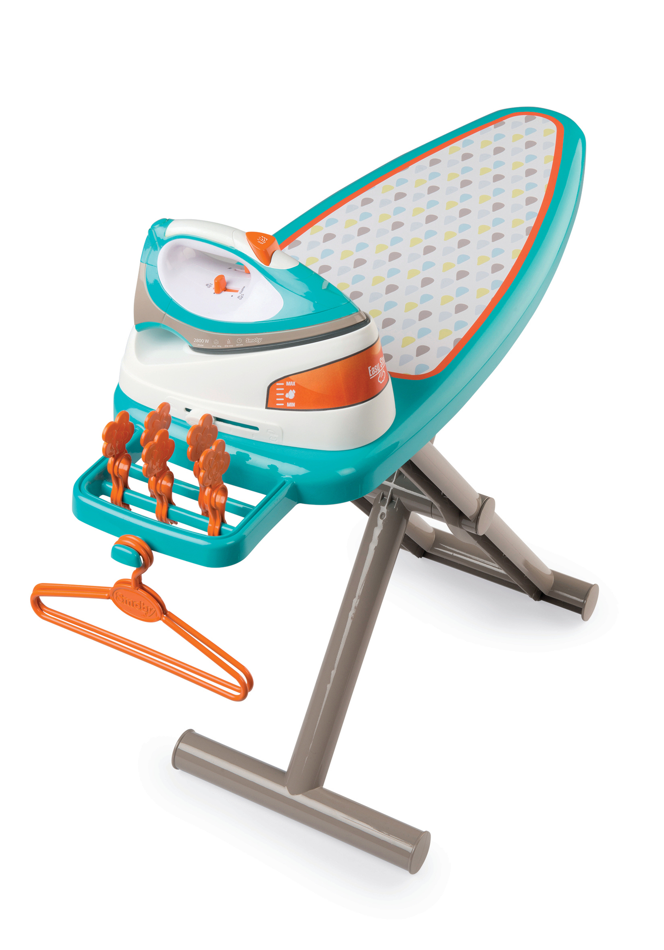 1 planche à repasser décorée avec IML, 1 centrale vapeur avec boutons cric-cric et 1 fer à repasser, 2 cintres et 5 pinces à linge .
