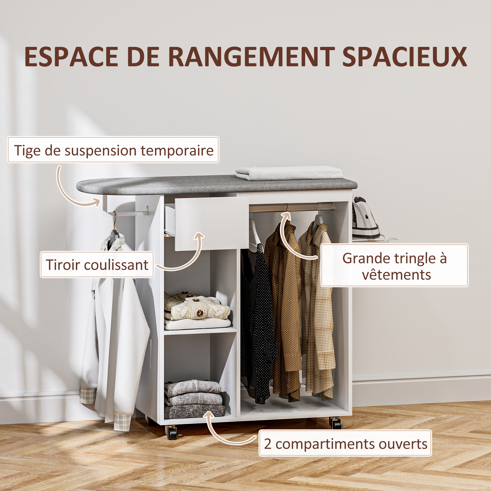 | Libellé | Table à repasser sur roulettes - 2 tringles, 2 niches, tiroir, support fer - toile planche incluse blanc gris |