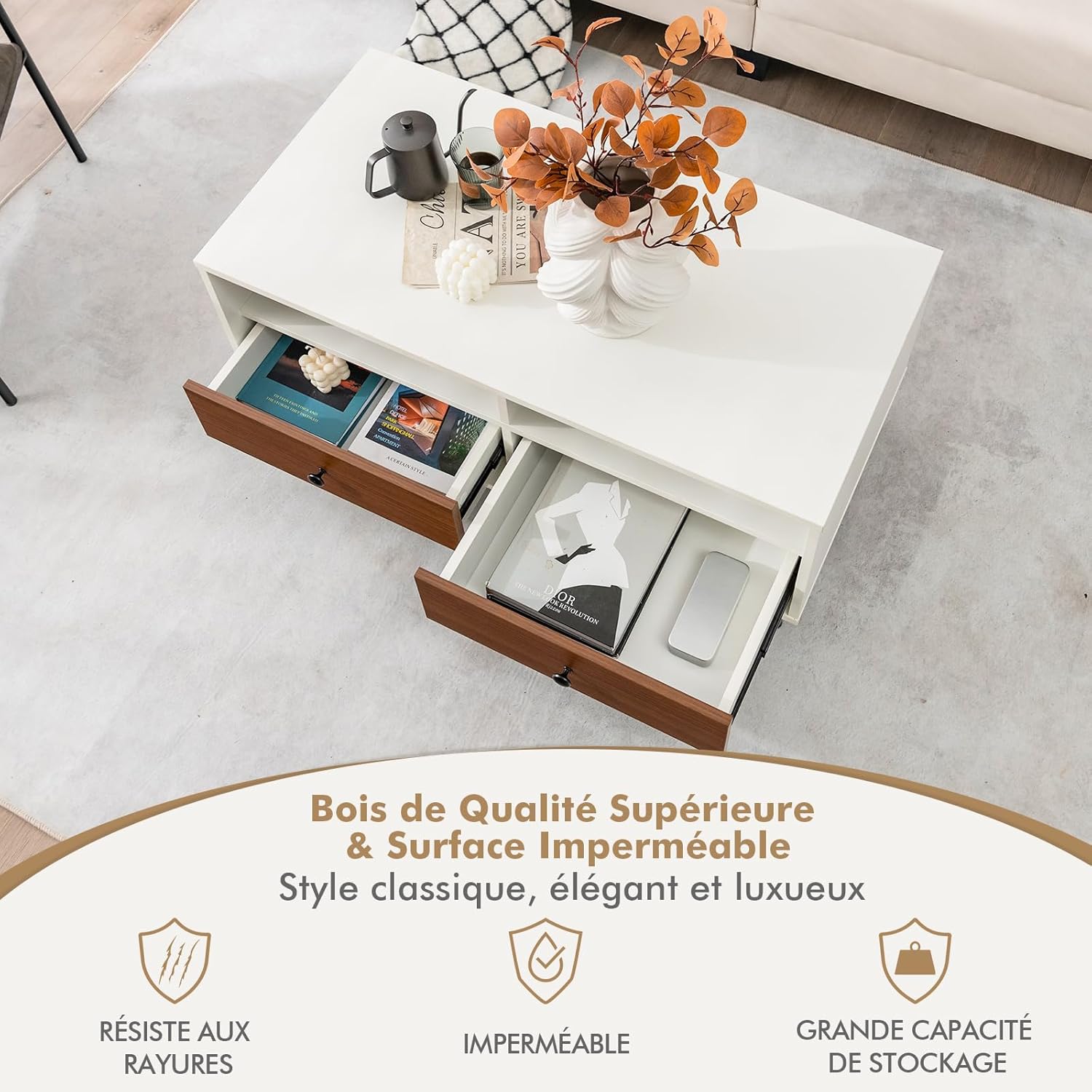 Table Basse 2 Tiroirs, Table Basse Salon avec 2 Compartiments, Table Rectangulaire Moderne, 4 Pieds en Mé