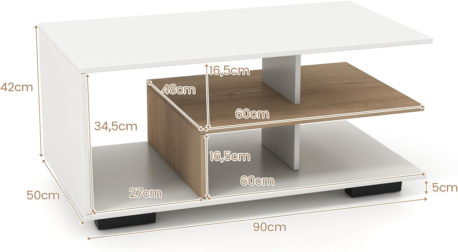 | Libellé | Table Basse avec Rangement, Table Basse Salon avec Etagères, Design Géométrique en L, Grand Compartiment, 90 x 50 x 42 cm (Blanc) |