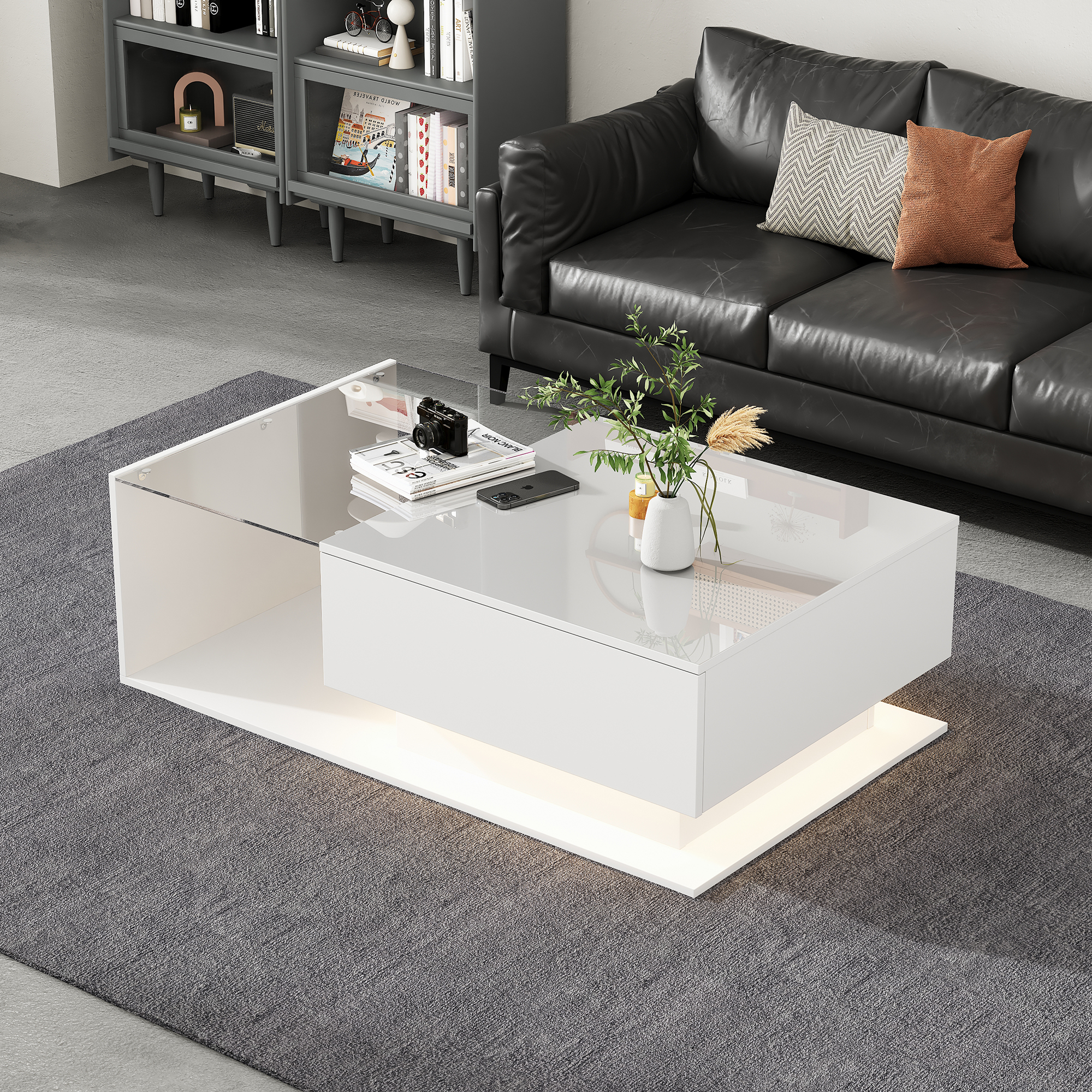 | Libellé | Table basse blanche 100x50x32cm, plateau en verre résistant aux rayures, 1 tiroir, éclairage LED |