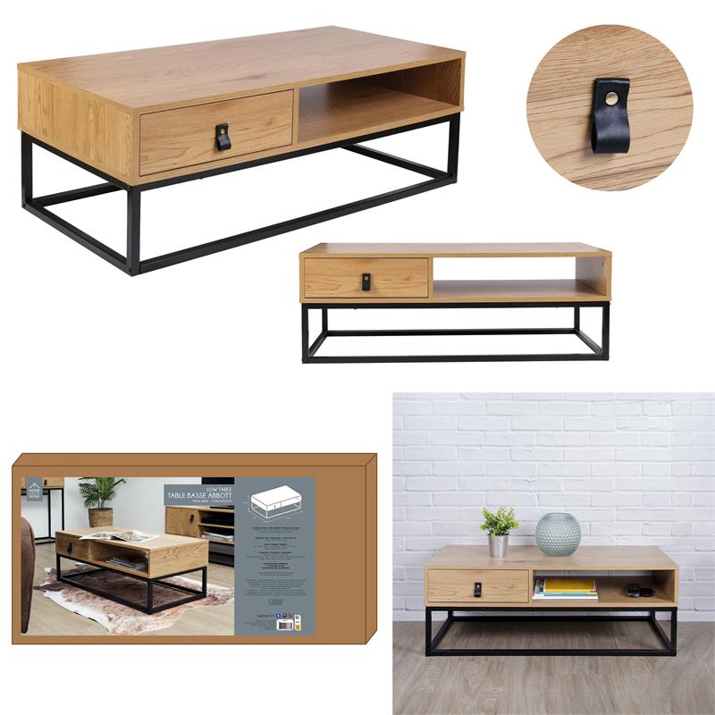 Table de salon 1 tiroir 1 niche traversante Abbott. Cette table basse apportera un style authentique à votre salon. Pratique, son tiroir permet un petit espace de rangement. Piètement en métal noir. A monter soi même. Dimensions : L100 x l50 x H36 cm. Poids : 17 kg. Matière : Fibres de bois MDF et métal. Marque : Home Déco Factory.