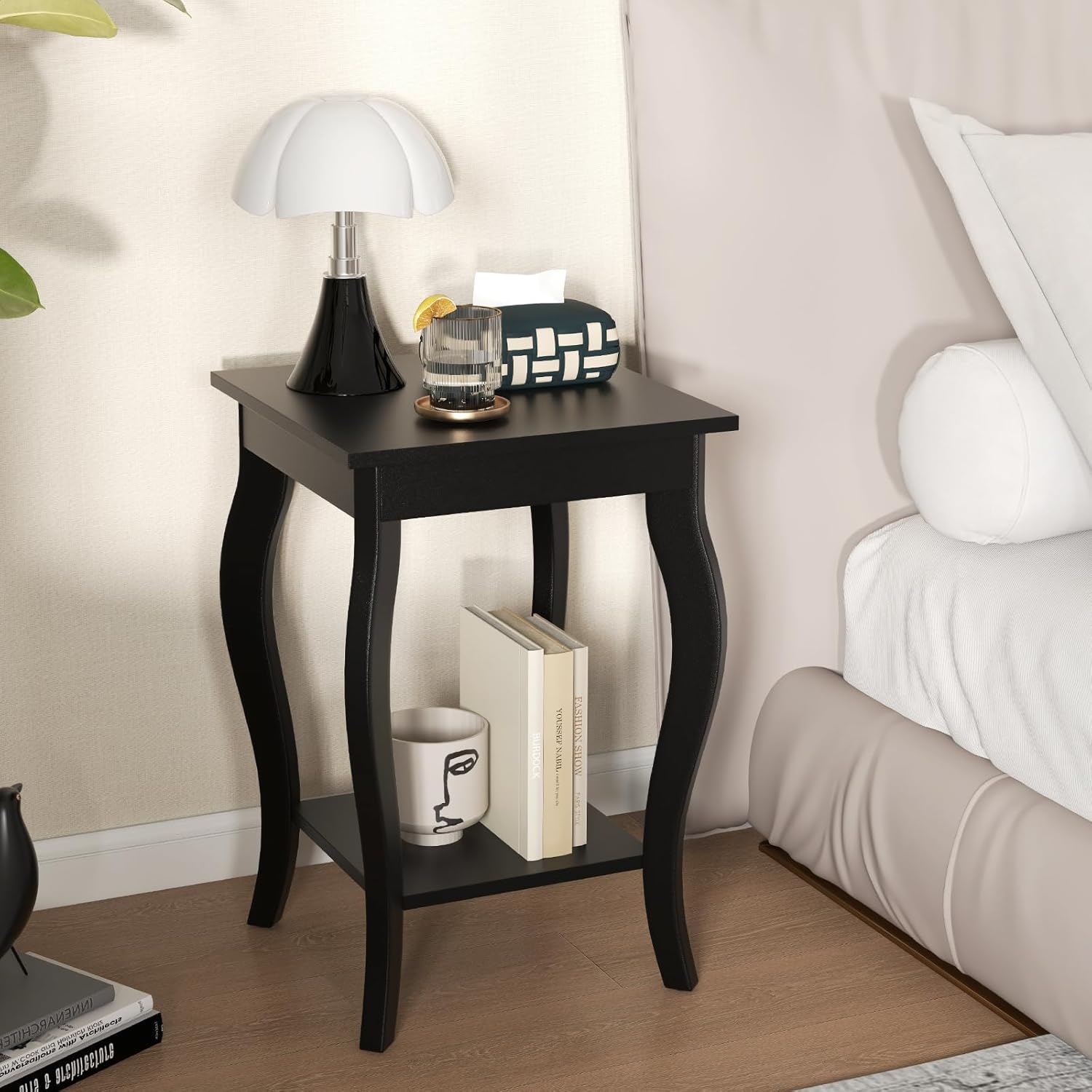 Table basse carrée, table d'appoint avec étagère et pied incurvé, table de nuit (1, noir)